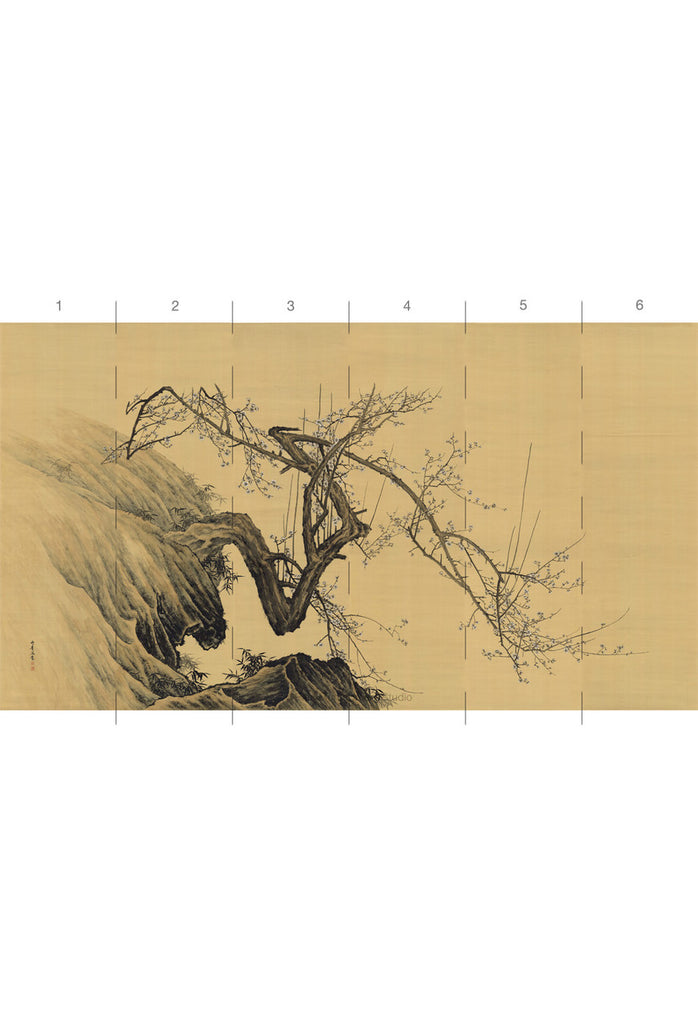 Rock Tree is a beautiful chinoiserie mural wallpaper panel inspired by Japanese ink wash painting. 6 Panels Available in Full Length/Headers/Footers, Sold in individual Panels, Width: 36", Design Height: 120", Total Height: 108", Rock Tree,Paul Montgomery Studios
