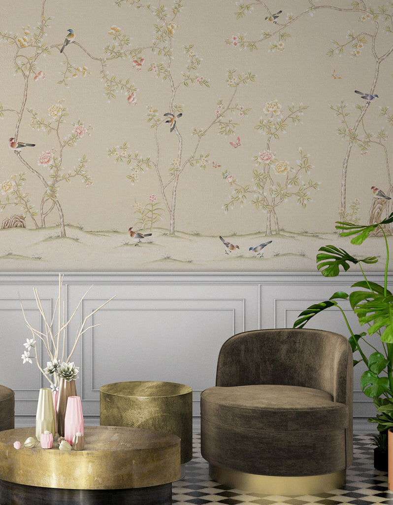 The Solitude chinoiserie mural is perfect as a subtle statement in a living or dining room. Depicting sparrows and pheasants among trees with white flowers on a light cream background. 6 Panels Available in Full Length/Headers/Footers, Sold in individual Panels, Width: 36", Design Height: 120", Total Height: 108", Solitude Taupe,Paul Montgomery Studios