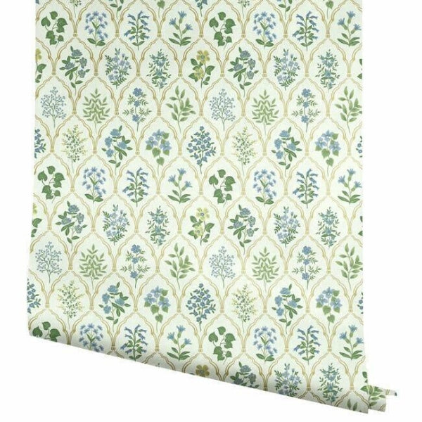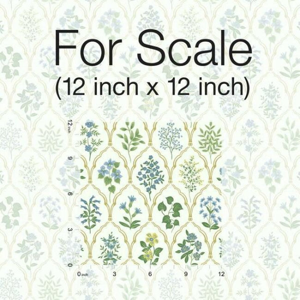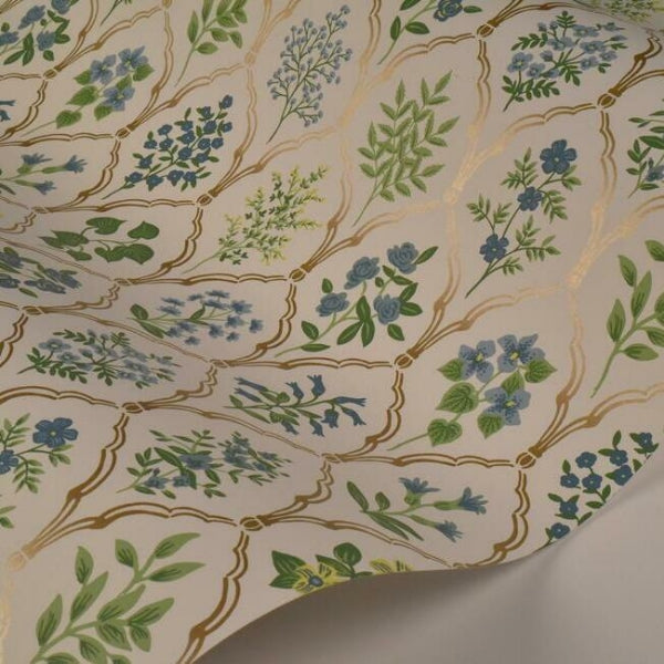 Hawthorne from Rifle Paper Co. features Sprays of assorted flowers standing under delicate arches that create a botanical grid with a vintage feel.