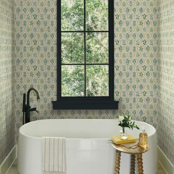 Hayden Blue,Green Hawthorne Botanical Beige Blue Wallpaper | Jeffrey Stevens