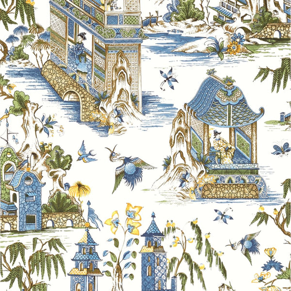 The Grand Palace collection introduces 100 SKUs that evoke a traditional elegance with chinoiserie inspired designs, a style created in Europe from influences of tales and travels to the Far East. These wallpapers with coordinating print, woven, and embroidered fabrics offer a unique juxtaposition of fanciful patterns featuring pagodas and Asian scenics with geometric companions and unexpected colors.