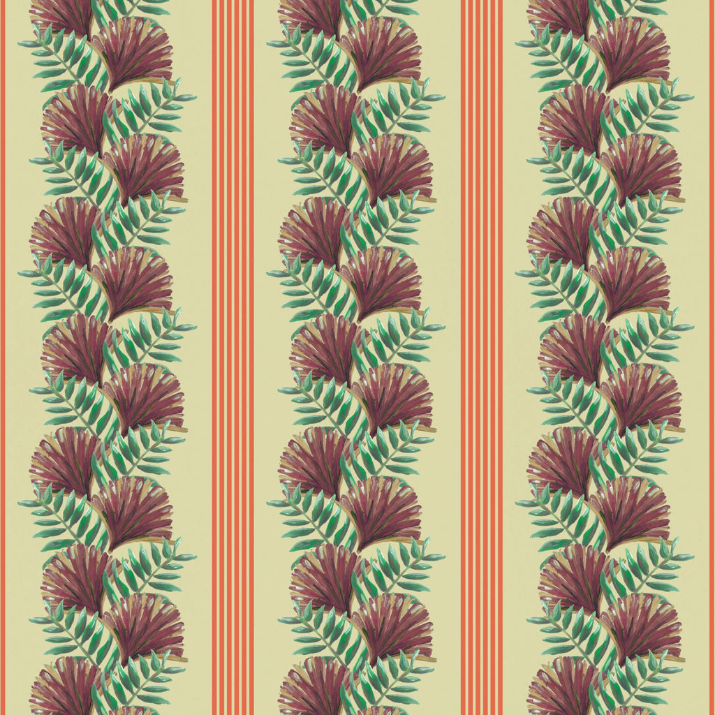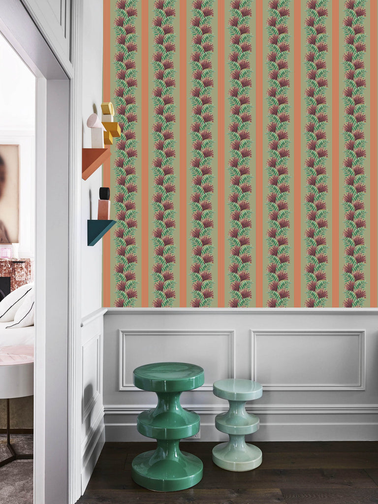 Paris Fan Green Wallpaper | Catchii Netherlands Europe The hand-painted wallpaper design features an elegant array of delicate leaves and fan-shaped flowers, creating a harmoniously balanced pattern. The colours of pine green and coral red create a contemporary palette that offers a fresh take on classic Parisian style.