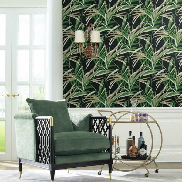 Trea Green,Black Tropical Paradise Botanical Beige Black Wallpaper | Jeffrey Stevens