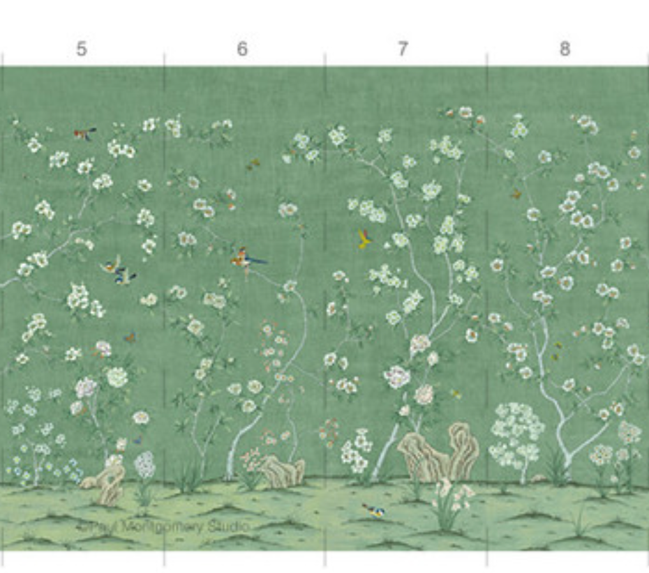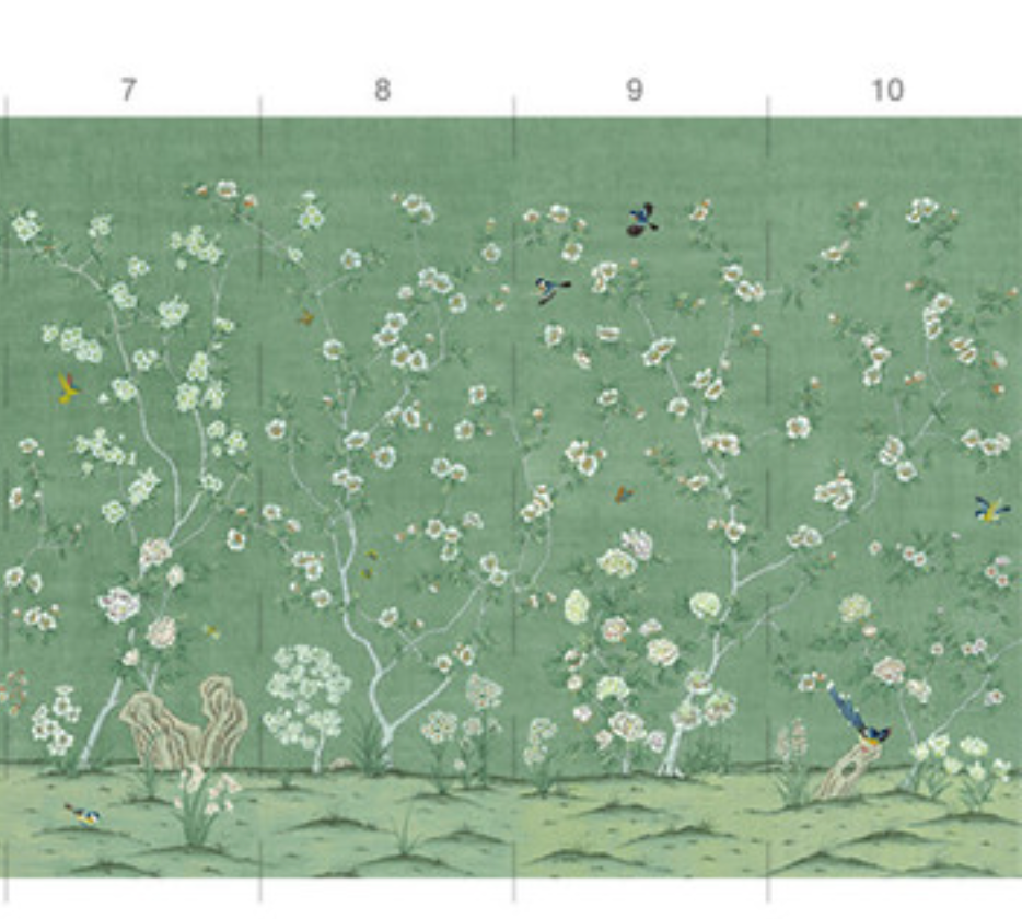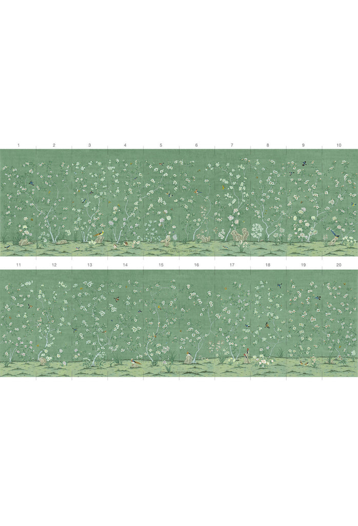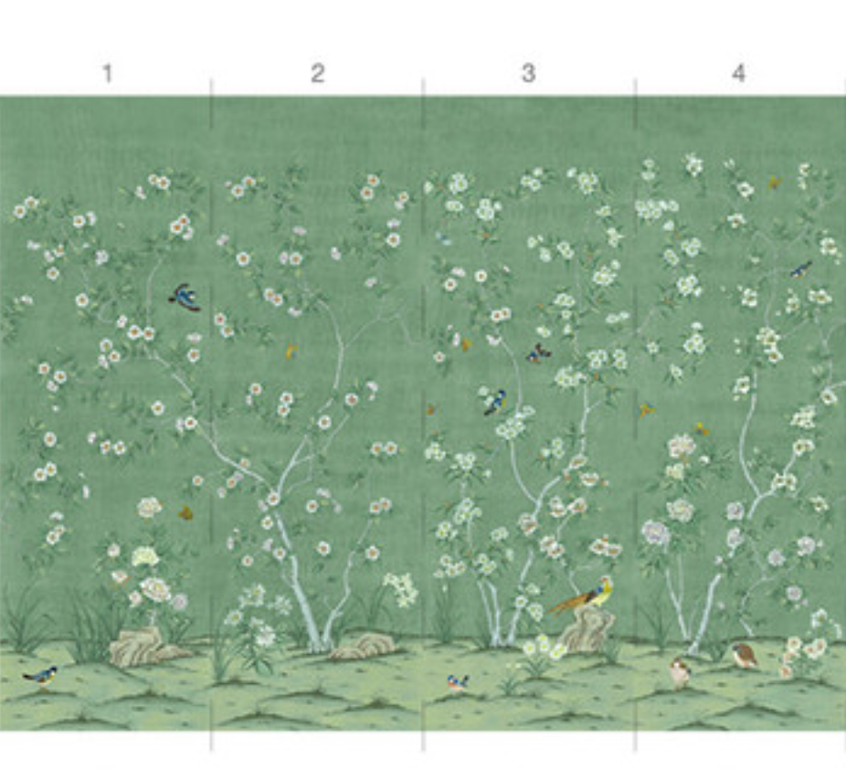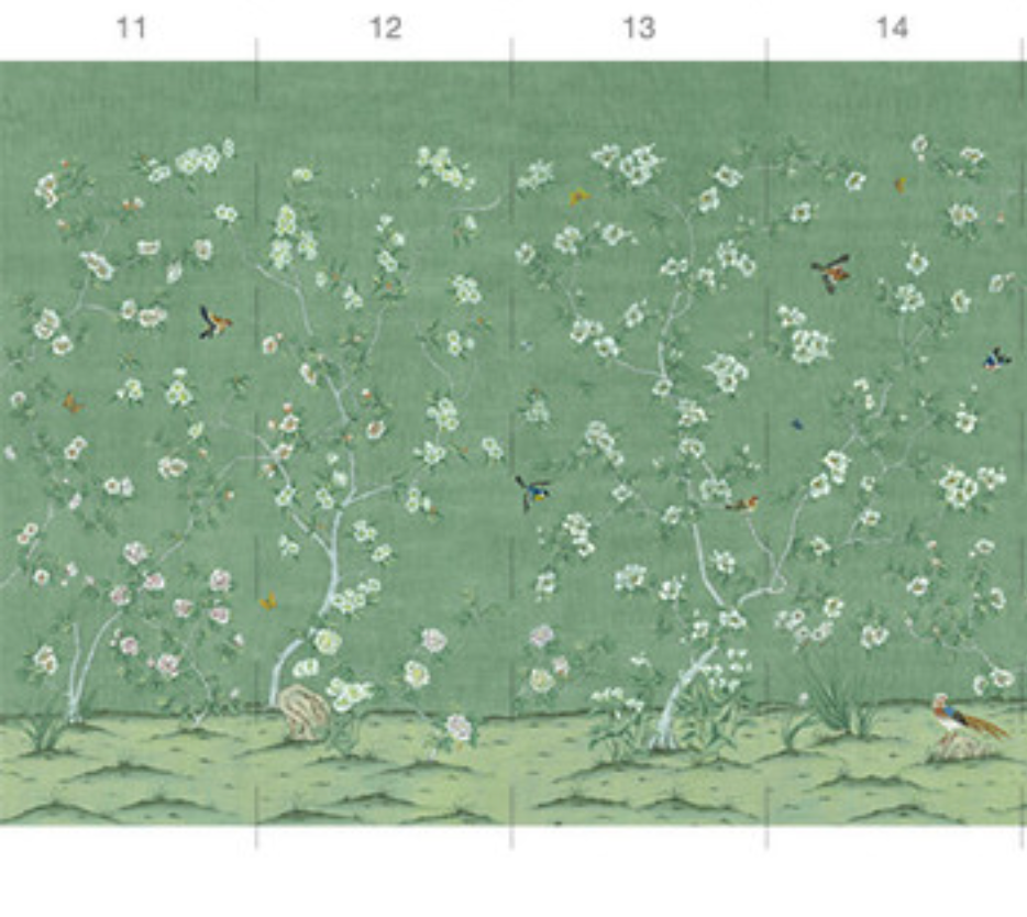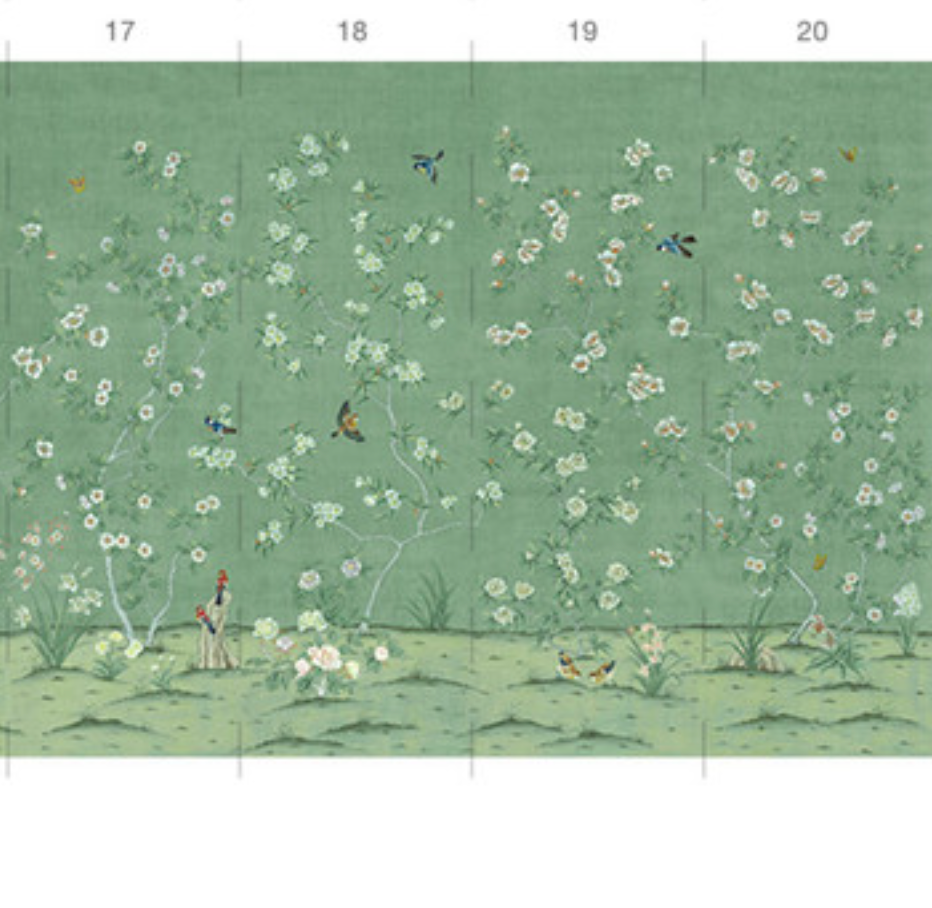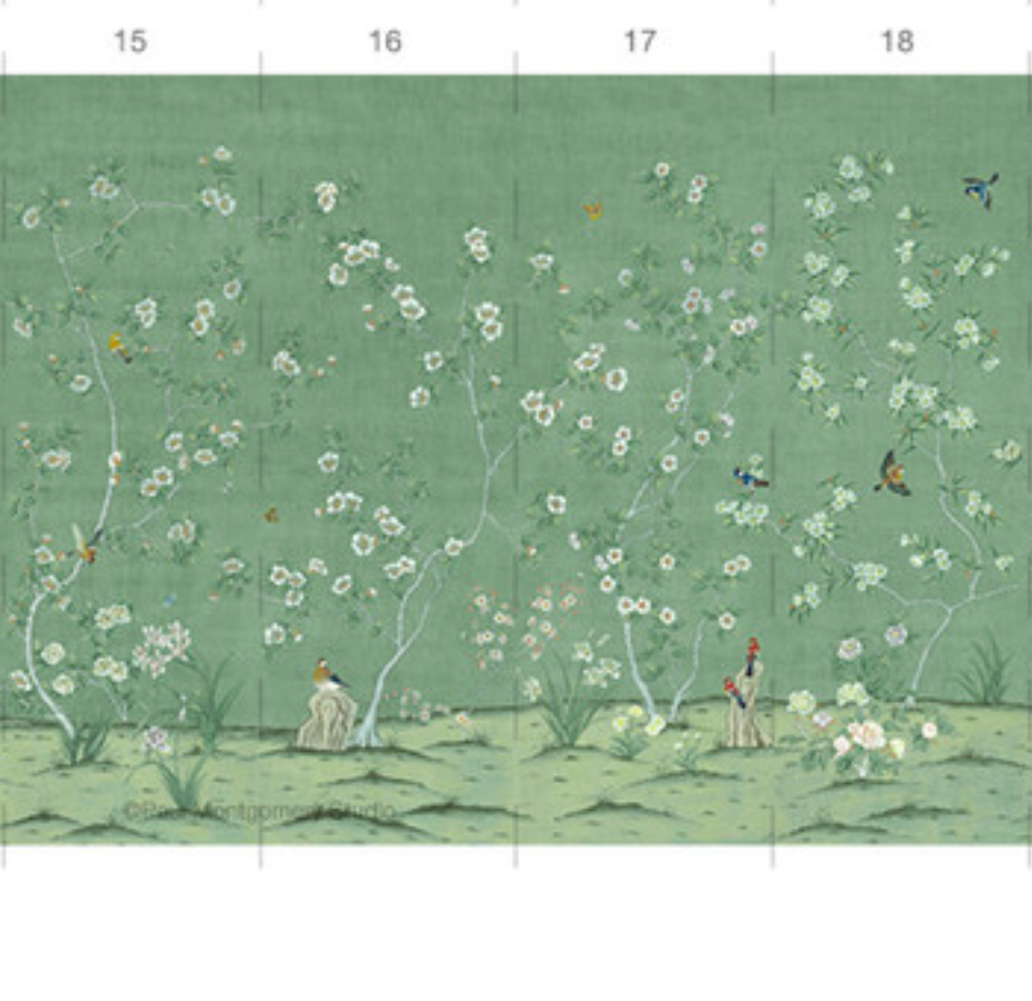 Picardy Emplastro is a lovely chinoiserie-style garden mural with flowering trees and birds on a mottled painted paper effect. 20 Panels Available in Full Length/Headers/Footers, Sold in individual Panels, Width: 36", Design Height: 108", Total Height: 96", Picardy Emplastro,Paul Montgomery Studios
