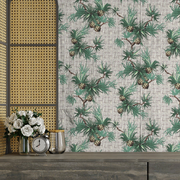 Nature-inspired wallpaper designs featuring trees, branches, and lush leaves.