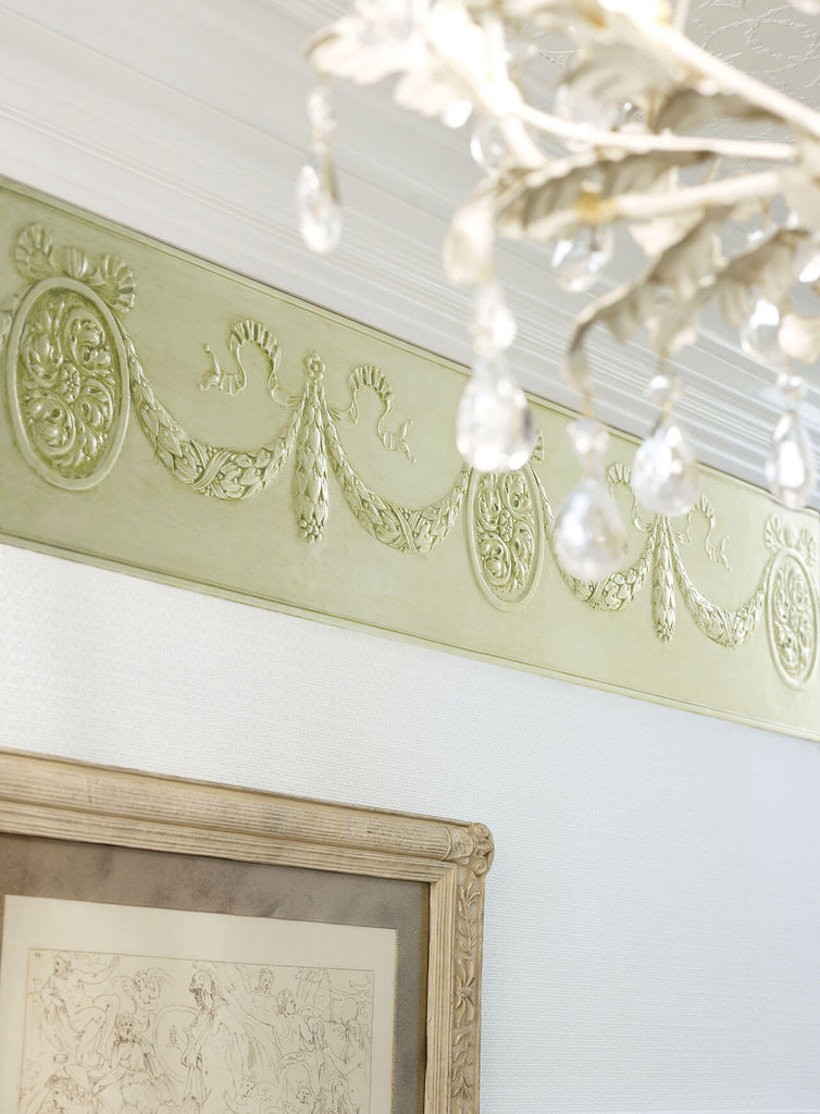 Framed floral motifs linked by richly detailed swags of laurel make up the stunning Cameo design. Intricate and visually interesting, it adds a regency touch to your walls.