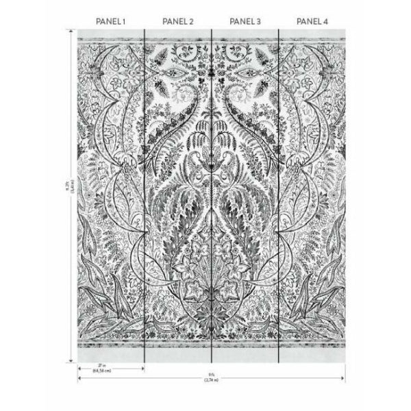 Four panel Jaipur Paisley Damask Mural is infused with a lavish floral and boteh pattern mix which captures the exotic beauty of the city known as the Paris of India. This Jaipur Paisley Damask Wall Mural measures approximately 27 inches wide by 11.