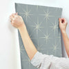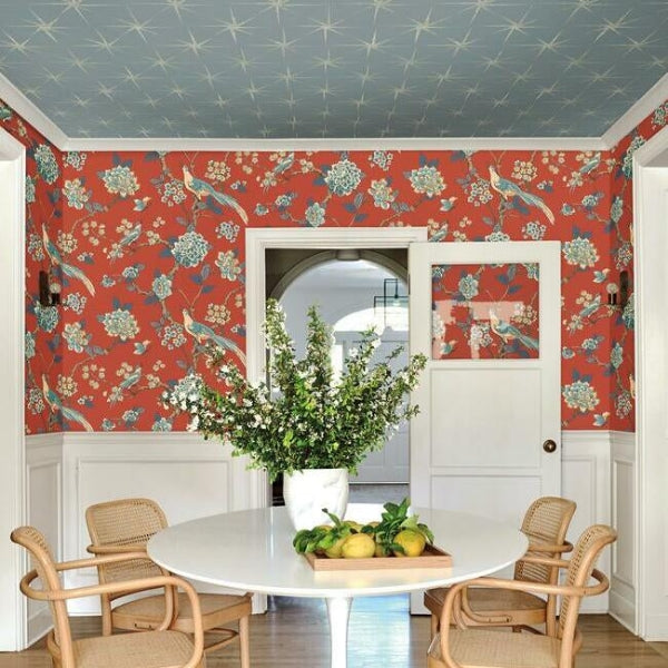 Shimmering pattern Evening Star is a blend of mid-century metallic and warm, cottage charm. This Evening Star Wallpaper measures approximately 27 inches wide by 27 feet long, covering About 60.