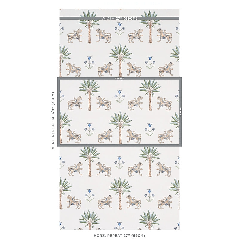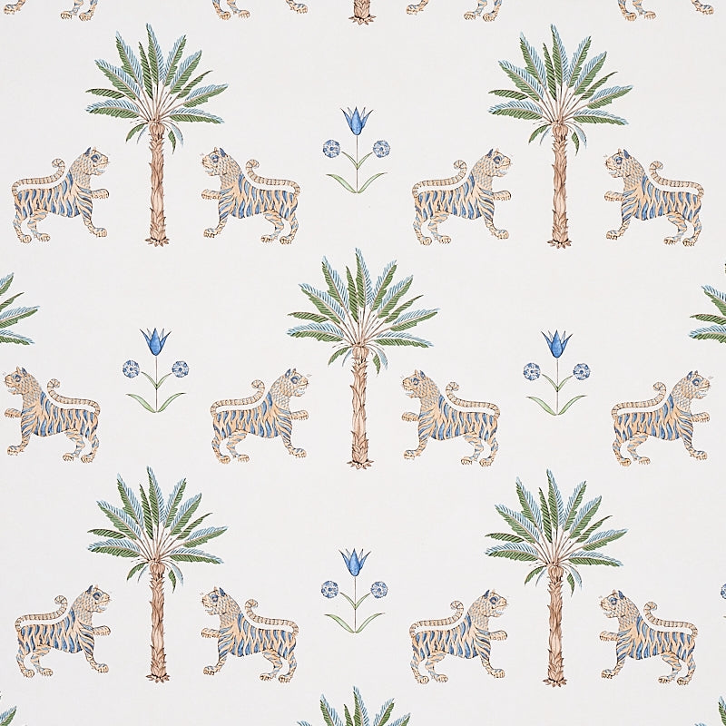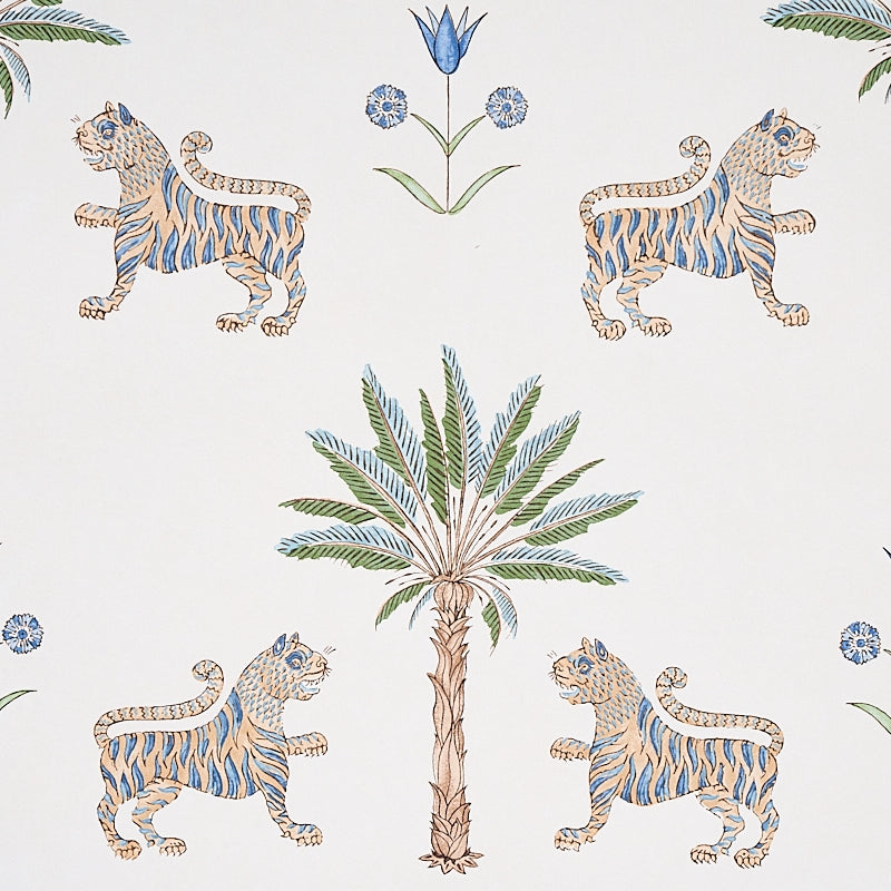 Lush palm leaves and tigers intertwine in a delicate Delft blue palette, creating an elegant, serene jungle scene. This Schumacher wallpaper brings a sophisticated tropical charm to any space. #interiors #luxurywallcoverings #elegantdesign