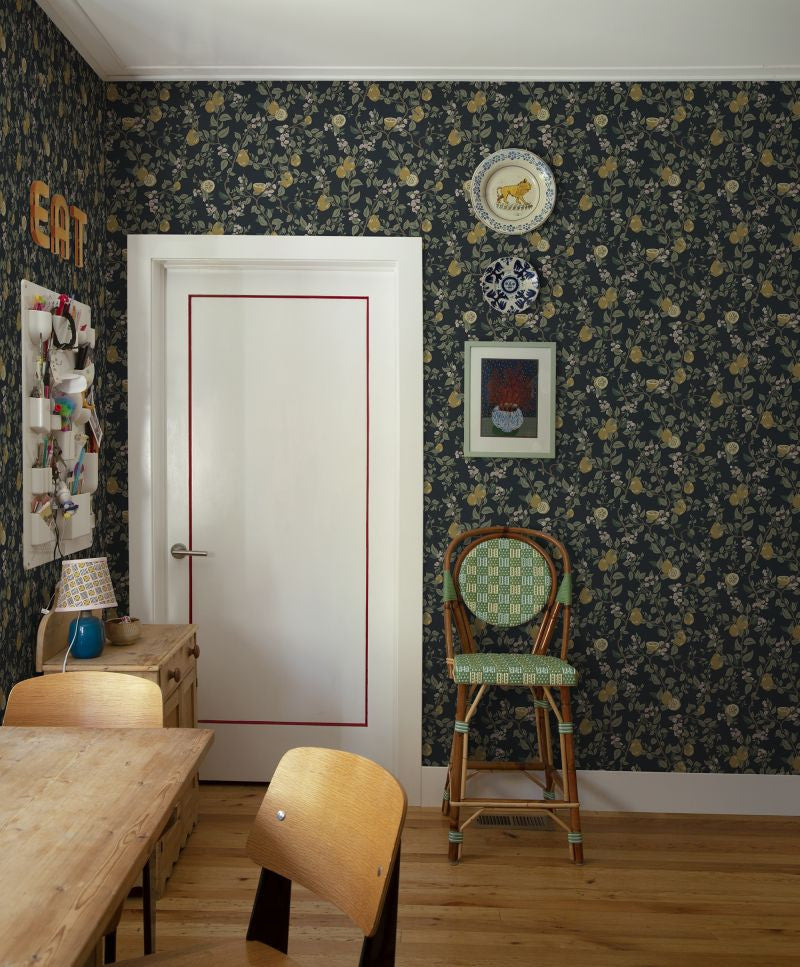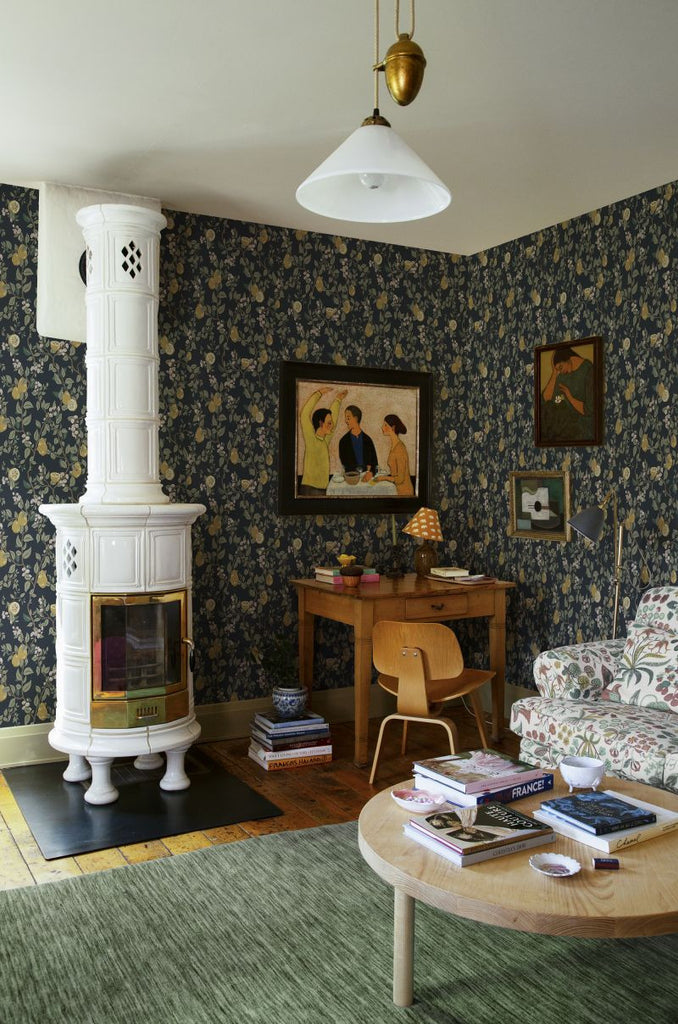 Kvitten dark blue is full of life and offers a rich botanical pattern with branches, leaves and quinces. The quince fruit and its red blossoms gives a crisp and modern contrast against the dark blue back drop. Available in two other colourways. Design: Sara Bergqvist