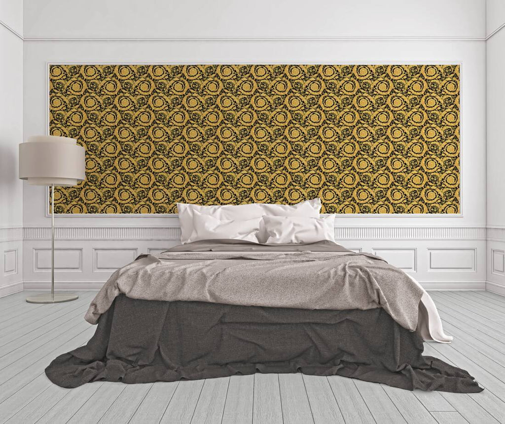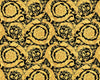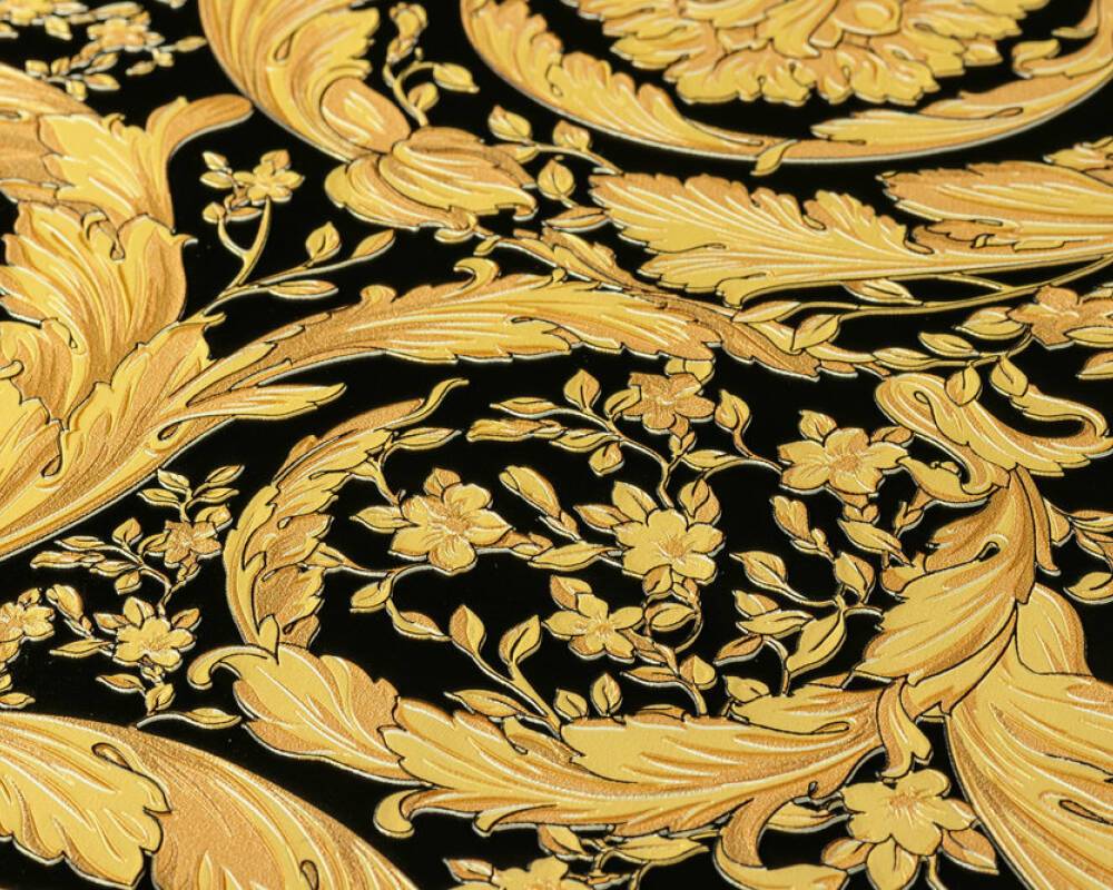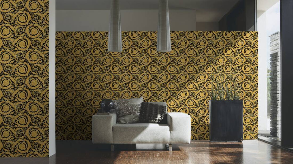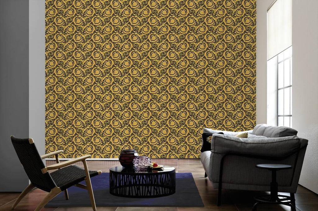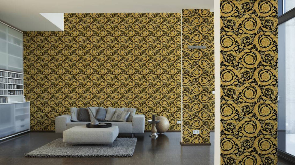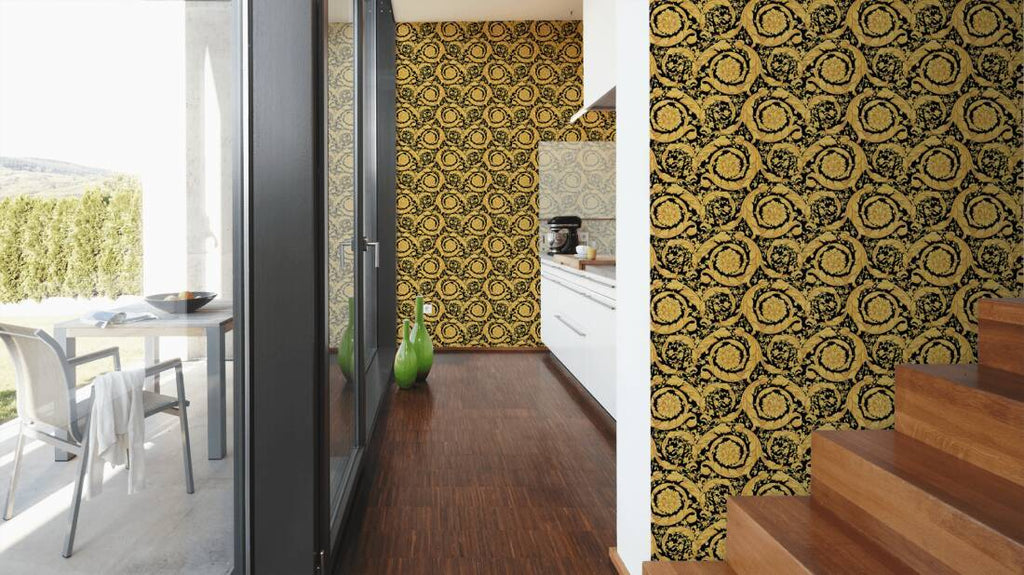 Ornate golden scrolls swirl over a deep black backdrop in the Levanzo Scroll Wallpaper | Versace—luxury redefined. #luxuryliving #wallart #versacestyle