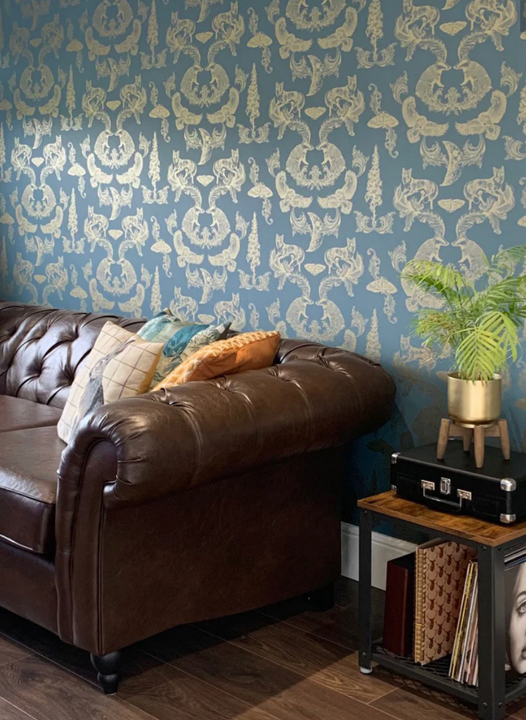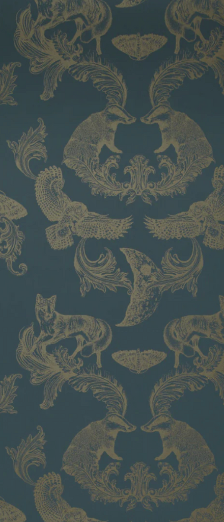 A beautiful wallpaper design by Laura Garner featuring charming hand drawn illustrations of whimsical woodland creatures including badgers, foxes and birds, all of which can be found nestled amidst forest foliage beneath a shimmering golden moon. Set upon an inky teal background, this stylish and sophisticated wallpaper is a modern and contemporary twist on the traditional damask style which will look stunning in a rural retreat or city living space.