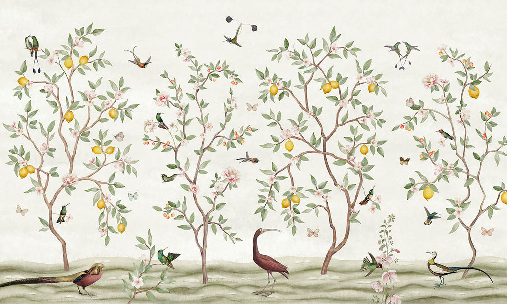 Each new design begins with a carefully considered concept—whether it’s a whimsical garden scene, a dramatic landscape, or a surreal menagerie. Once the theme and style are set, we assign the most fitting illustrator to hand-paint the design’s elements: from exotic animals captured in motion to delicate florals, vast skies, lush trees, and more. Every illustration is painted individually and then seamlessly layered into the full composition.