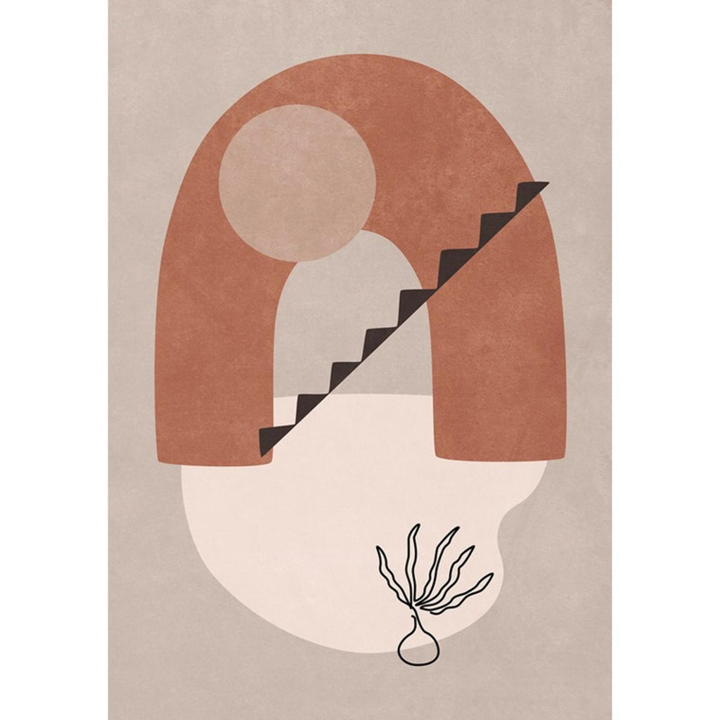 Terracotta Archway is a striking abstract piece that features bold architectural forms and organic elements in warm terracotta tones. The composition showcases a prominent archway with a circular element above, complemented by stylized stairs leading downwards. Delicate line work adds depth and detail, creating a balanced and inviting visual that enhances contemporary spaces with a touch of sophistication.