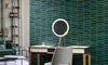 This wallcovering features a modern geometric pattern with alternating green and gray rectangular blocks. The mica finish adds a subtle shimmer, enhancing the contemporary aesthetic and creating a visually interesting texture.