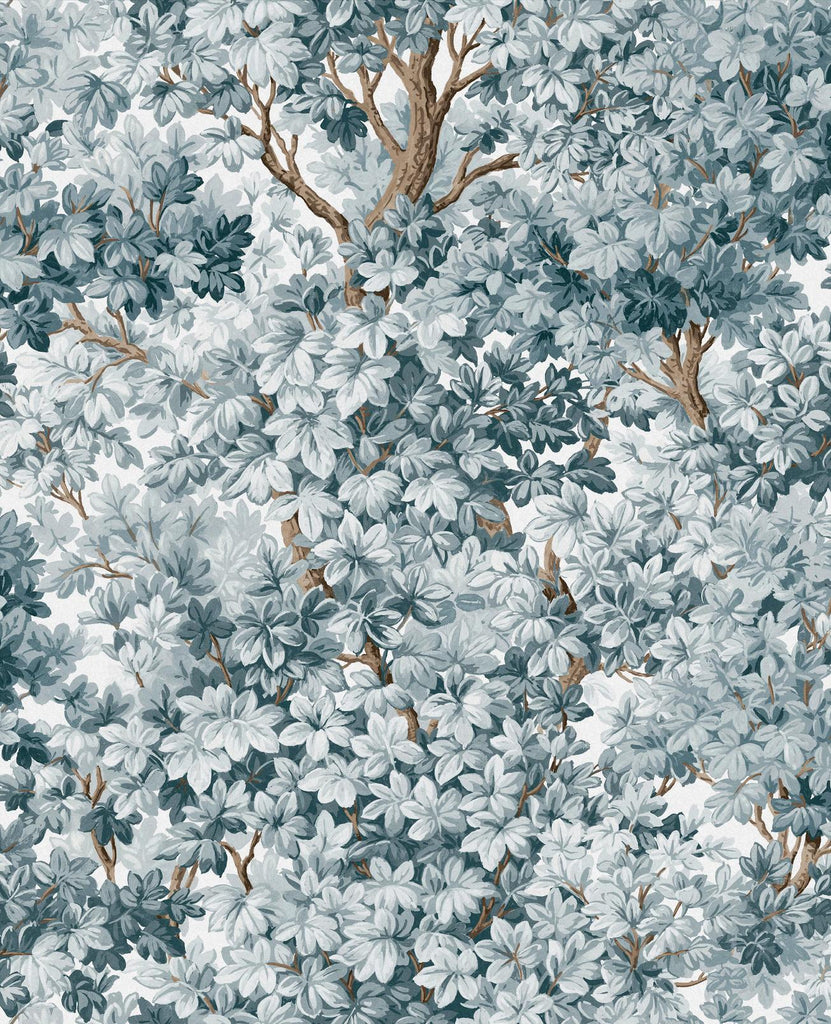 This "Blue" wallcovering features a dense botanical pattern with a classic, sophisticated feel. The muted blue and brown tones create a calming yet elegant atmosphere, making it suitable for a variety of commercial spaces.