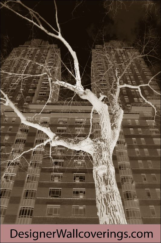 This wallcovering features an abstract, inverted image of a tree against a building backdrop, creating a unique and modern aesthetic. The neutral color palette makes it versatile for various commercial spaces, adding a touch of urban nature to the interior.