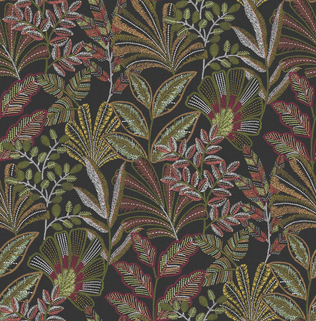 This "Damson" wallcovering features a rich, embroidered botanical design on a dark background, creating a sophisticated and timeless aesthetic. Its intricate detailing and classic color palette make it suitable for creating a refined atmosphere in commercial spaces.