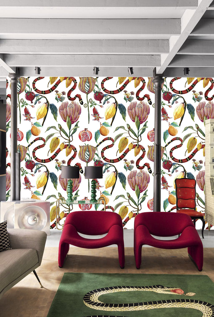 Lush Garden White Wallpaper | Catchii Netherlands Europe Go for a totally wild wall with our hand-painted wallpaper 'Lush Garden'. The extraordinary colour combinations give your interior an instant boost. Discover every day with this statement wallpaper.