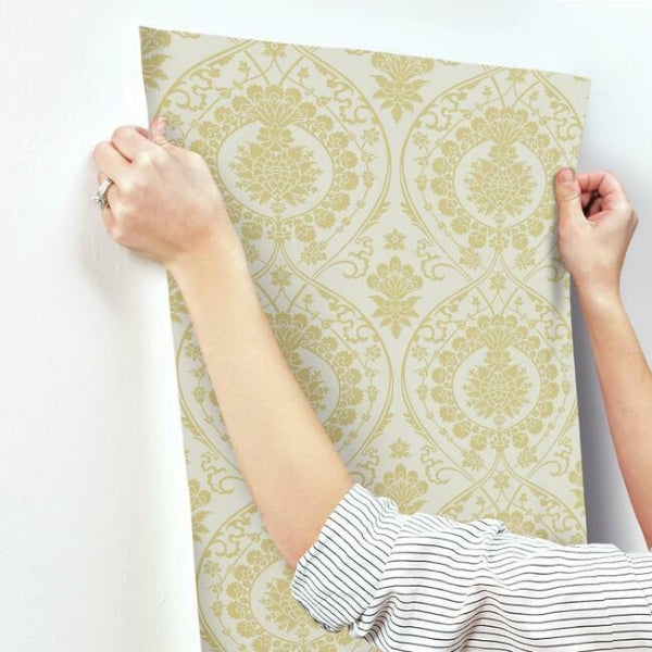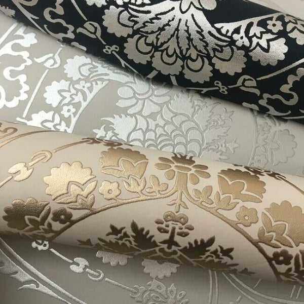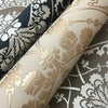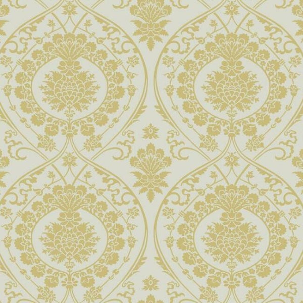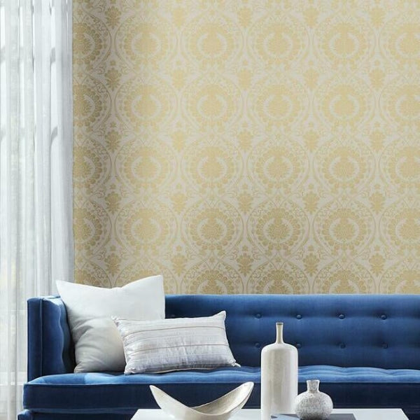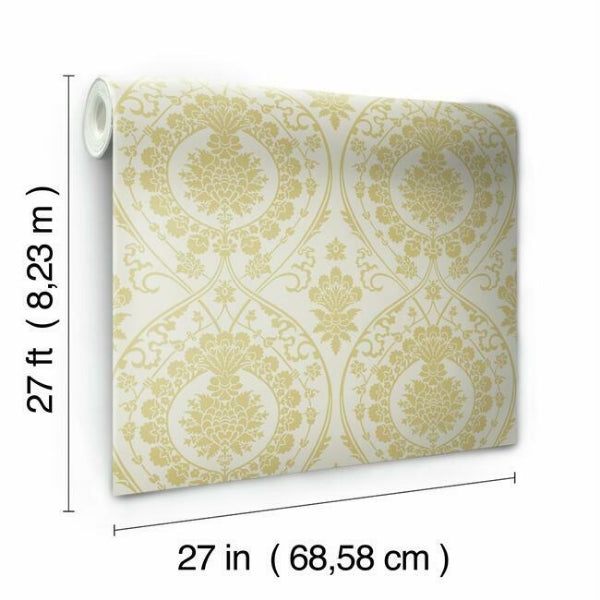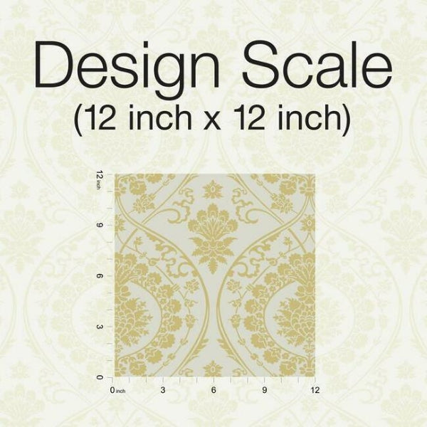 The metallic floral and scroll medallions of a vintage silk tapestry become the central theme of pattern Imperial Damask. This Imperial Damask Wallpaper measures approximately 27 inches wide by 27 feet long, covering About 60.