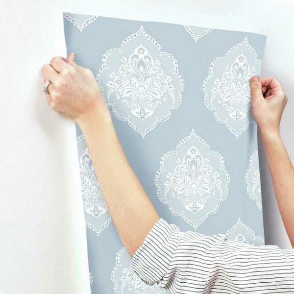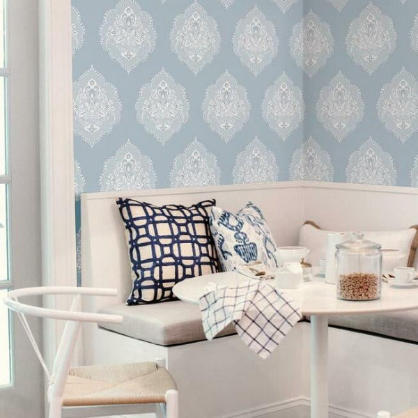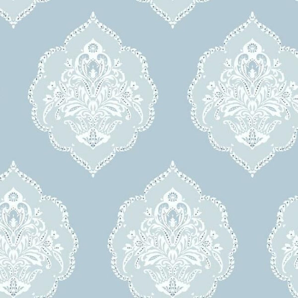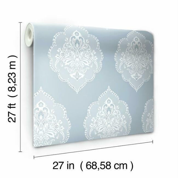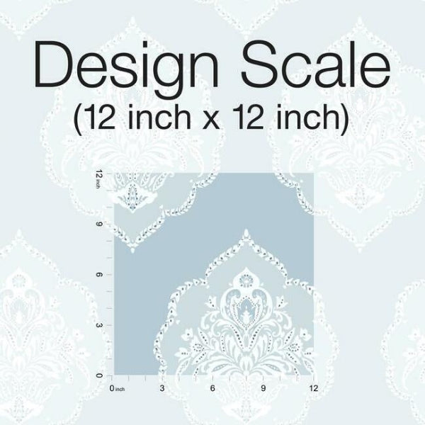 The leafy medallion crests of a signet ring act as an inspiration for pattern Signet Medallion Damask. This Signet Medallion Damask Wallpaper measures approximately 27 inches wide by 27 feet long, covering About 60.