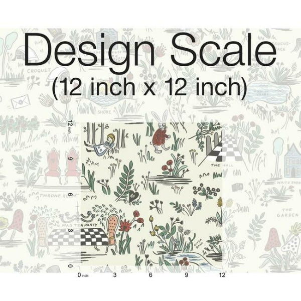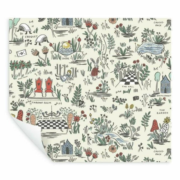 The Wonderland wallpaper was inspired by the classic tale, and is full of colorful, whimsical illustrations of some of the most-loved scenes and characters. This Wonderland Peel & Stick Wallpaper measures approximately 27 inches wide by 20 feet long, covering About 45 square feet per roll.