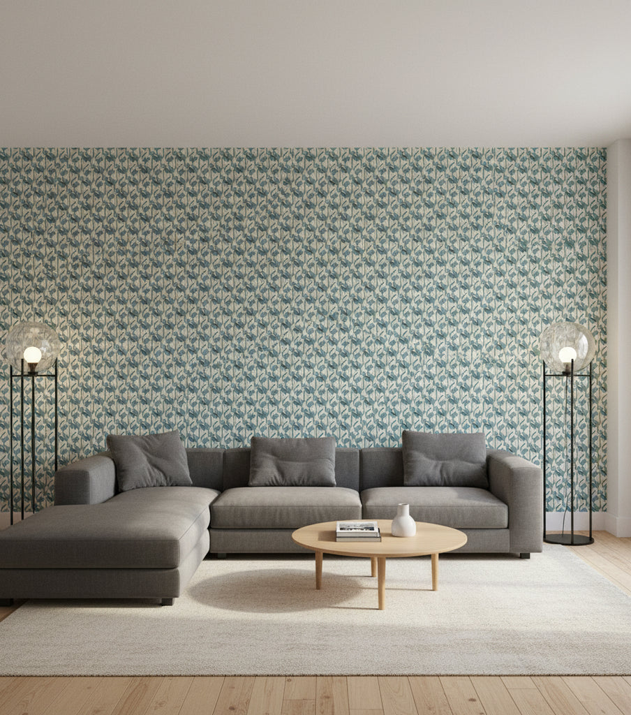 This wallcovering features a geometric pattern with a contemporary style. The color palette includes blue, green, and beige, creating a visually appealing and modern design. It is a vinyl material.