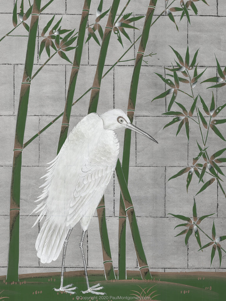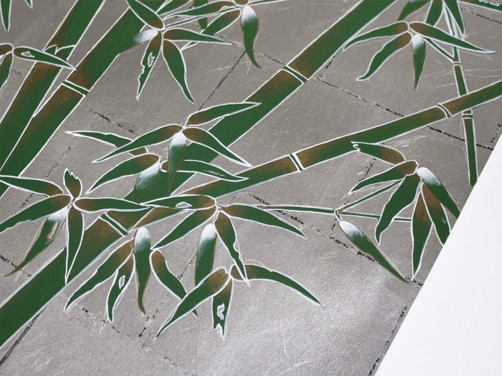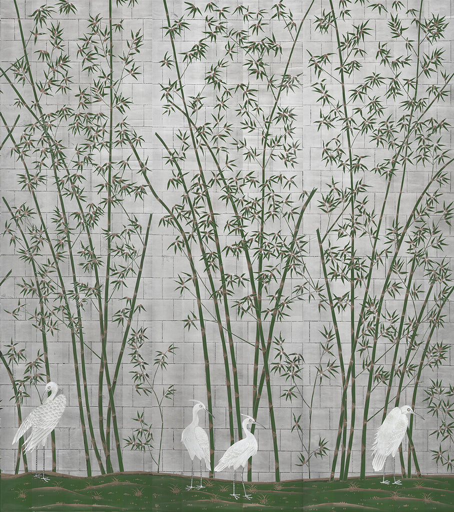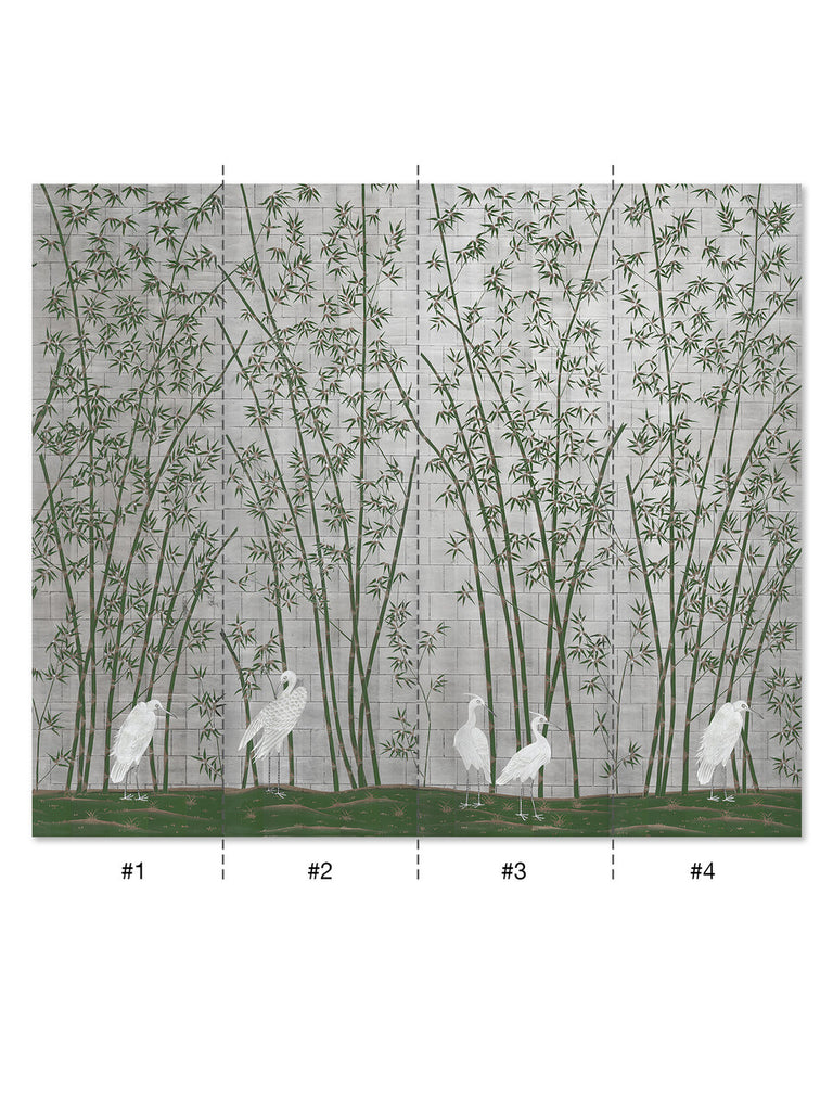 Bamboo and Cranes is an exotic mural of bamboo trees with a group of majestic white cranes below. This mural is hand painted on silver metal leaf paper. The bamboo trees are delicately wrought in a deep green with white lines and gold highlights. The full mural is made up of a series of individual panels, each 3 feet wide. The panels are 10 feet tall. The full mural is 4 panels, and 12 feet wide.
