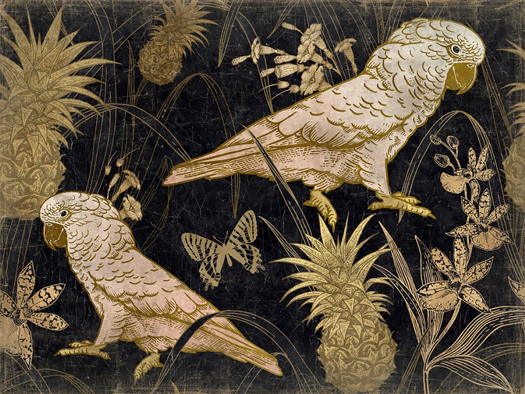 Graceful white parrots perch amid delicate tropical foliage in this serene Paul Montgomery art print. A timeless accent for refined interiors. #luxuryinteriors #artinspiredwalls #homedecorstyle