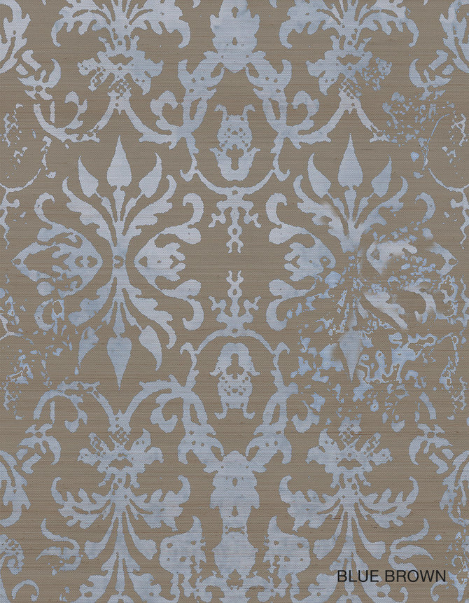 Antique Damask 1 Blue Brown On Silver Sisal Wallpaper | Paul Montgomery
