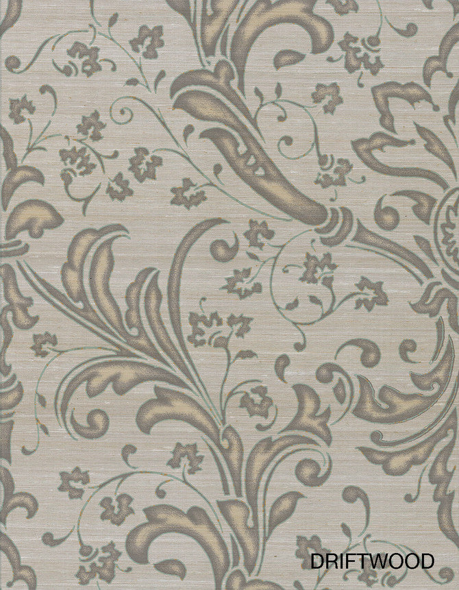 Chiara Large Scale Damask Driftwood On Silver Sisal Wallpaper | Paul Montgomery