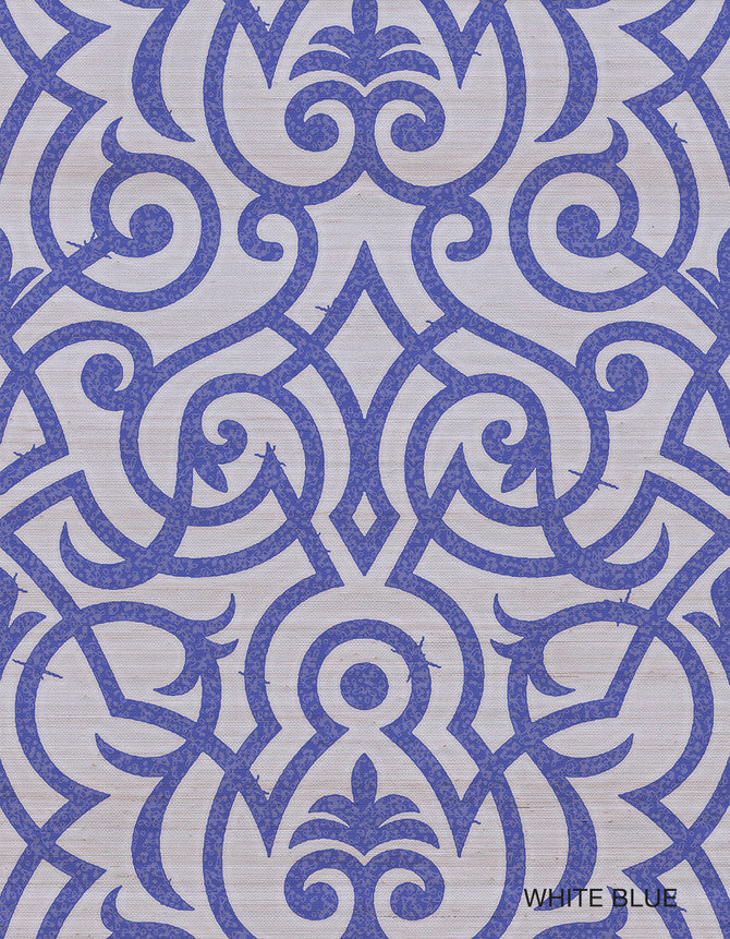 This foundational scrolling patterned Damask has been use for hundreds of years and is refreshing in great color combinations and enhanced by the texture of the Sisal and silver background. Sold by the panel in standard lengths. Pattern is 35" wide after trim by installer