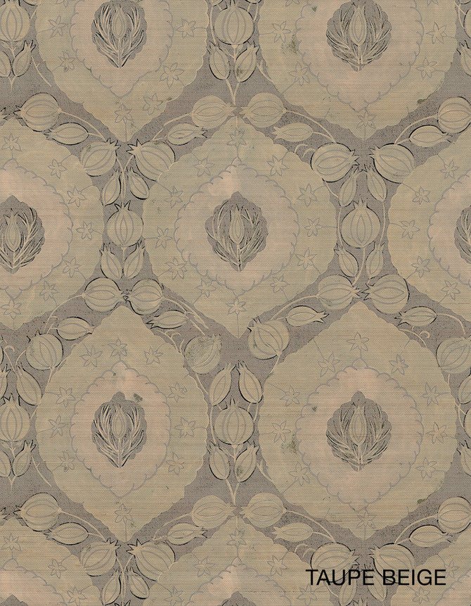 The Tulip was an important ottoman motif. Here we see the Tulip surrounded by a modified Pomegranate laurel wreath. Our color ways result in an almost rural or country cottage effect when printed on Sisal grasscloth. Sold in standard lengths from 1 to 4 yards. Pattern is 35" wide after trim by insta