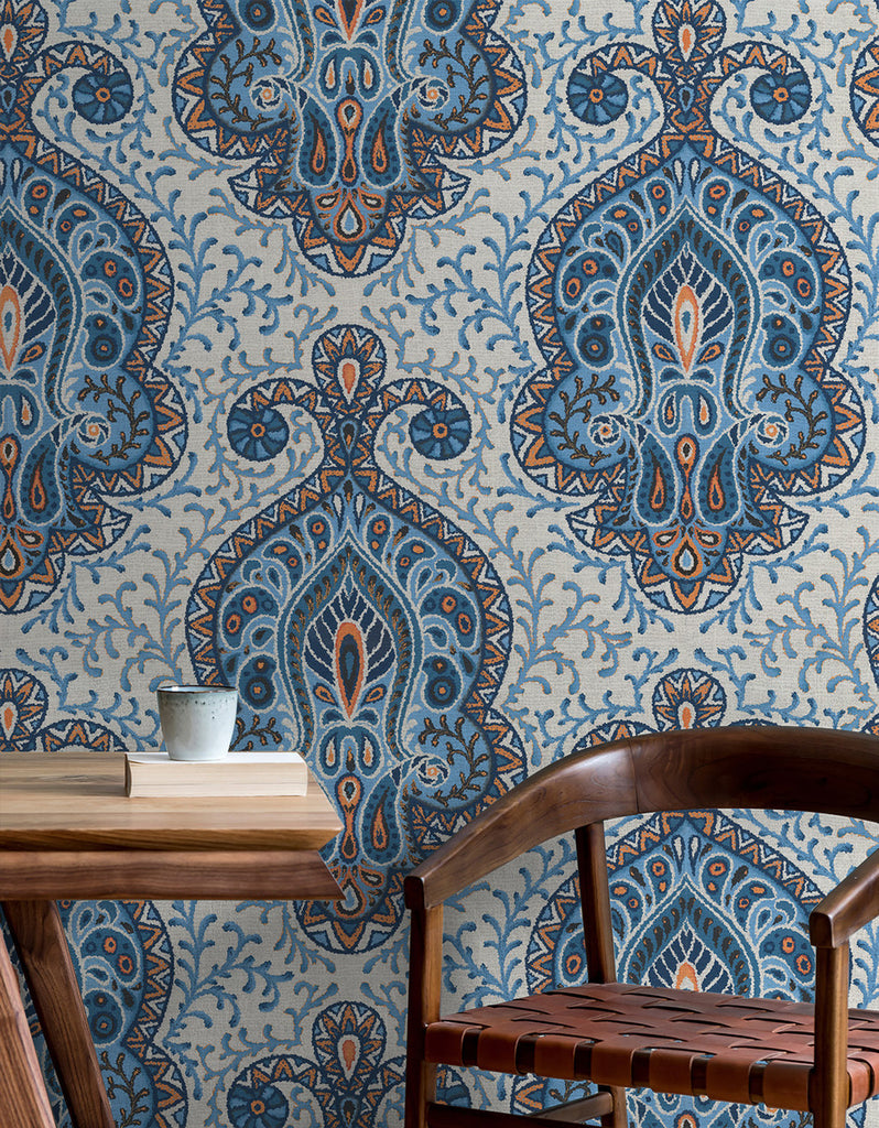 Nepalese theme reaches new heights of design with a bold sense and exotic colors. Pattern is 36" wide after trim by installer. A beautiful patterned wallpaper in our Cabinet of Curiosities by Paul Montgomery collection
