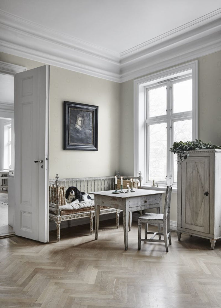 Karl grey is a wallpaper with a classic design inspired by the 18th century. The beauty of the olive wreath has been loved since ancient times. On our wall, it turns into a delicate and decorative piece of jewellery. In addition to being pretty, the olive wreath symbolises strength, wealth and stability. Design: Karolina Kroon