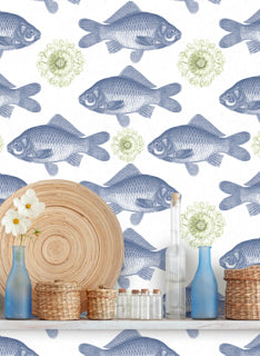 Graceful aquatic forms glide across a deep blue backdrop in the Fish Blue Wallpaper by Mind the Gap—sophisticated and serene. #luxuryinteriors #designerwalls #wallartdecor