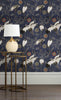 Graceful cranes soar across a deep indigo sky in the Tsuru Indigo Wallpaper by Mind the Gap—serene and striking. #luxurywalls #homedecorstyle #elevatedinteriors