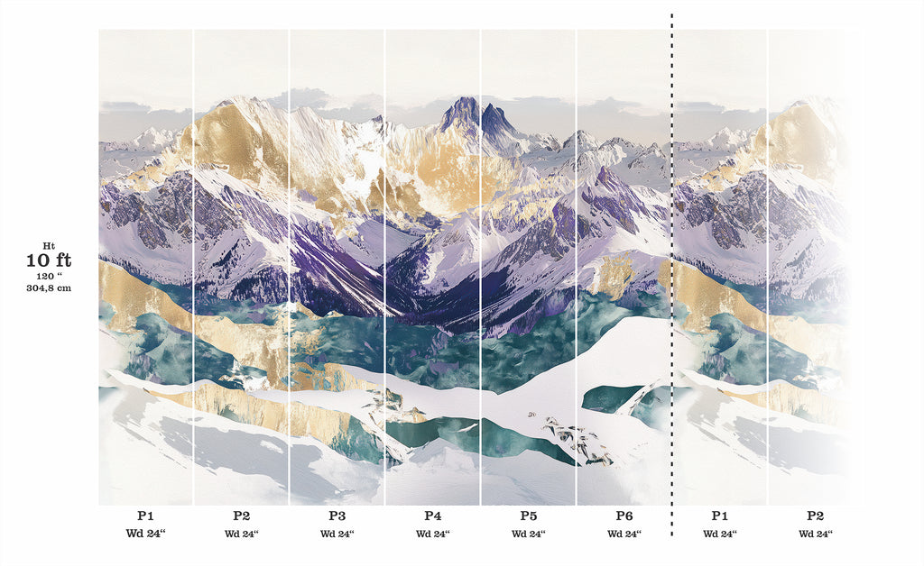 This awe-inspiring mural captures the beauty of snow-capped mountains, adorned with soft purple hues, shimmering gold accents, and teal tones, blending realism with abstract elegance.