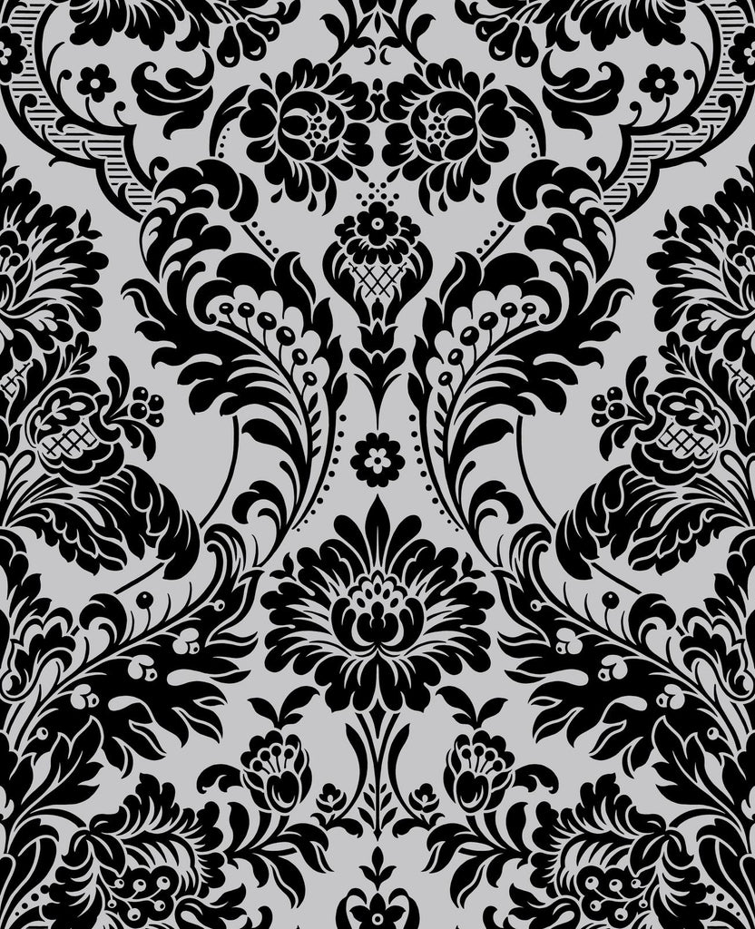 Gothic Damask Flock Black & Silver Wallcovering | Graham & Brown
