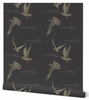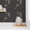 This wallcovering features a flock of gulls in flight, creating a sense of movement and freedom. The color palette is a muted gray with subtle white accents and pops of red, lending a sophisticated and calming mood. Ideal for creating a serene atmosphere in boutique residences, hospitality environments, or executive offices.