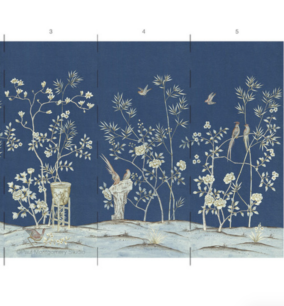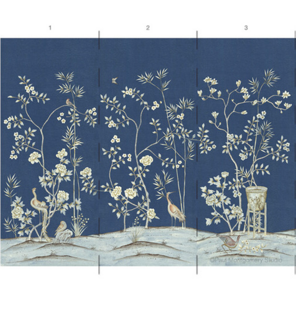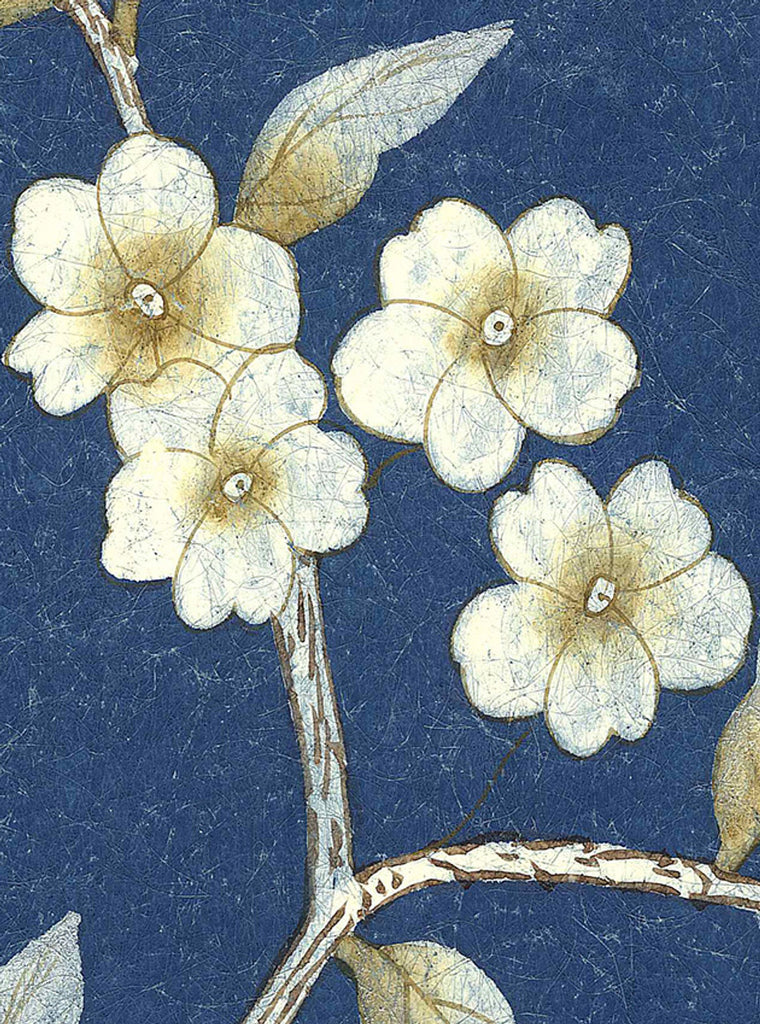 Chai Wan Royal depicts beautiful blooms and large birds. The design has 6 panels before pattern repeats. 6 Panels Available in Full Length/Headers/Footers, Sold in individual Panels, Width: 36", Design Height: 108", Total Height: 96", Chai Wan Navy,Paul Montgomery Studios