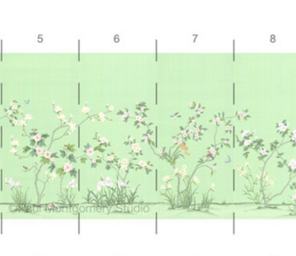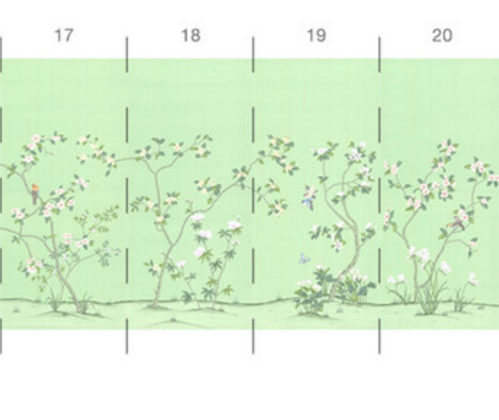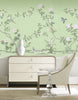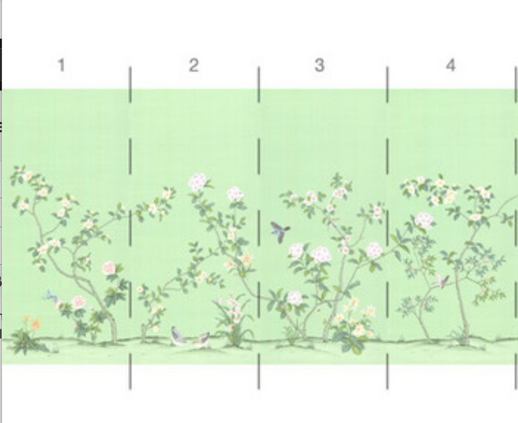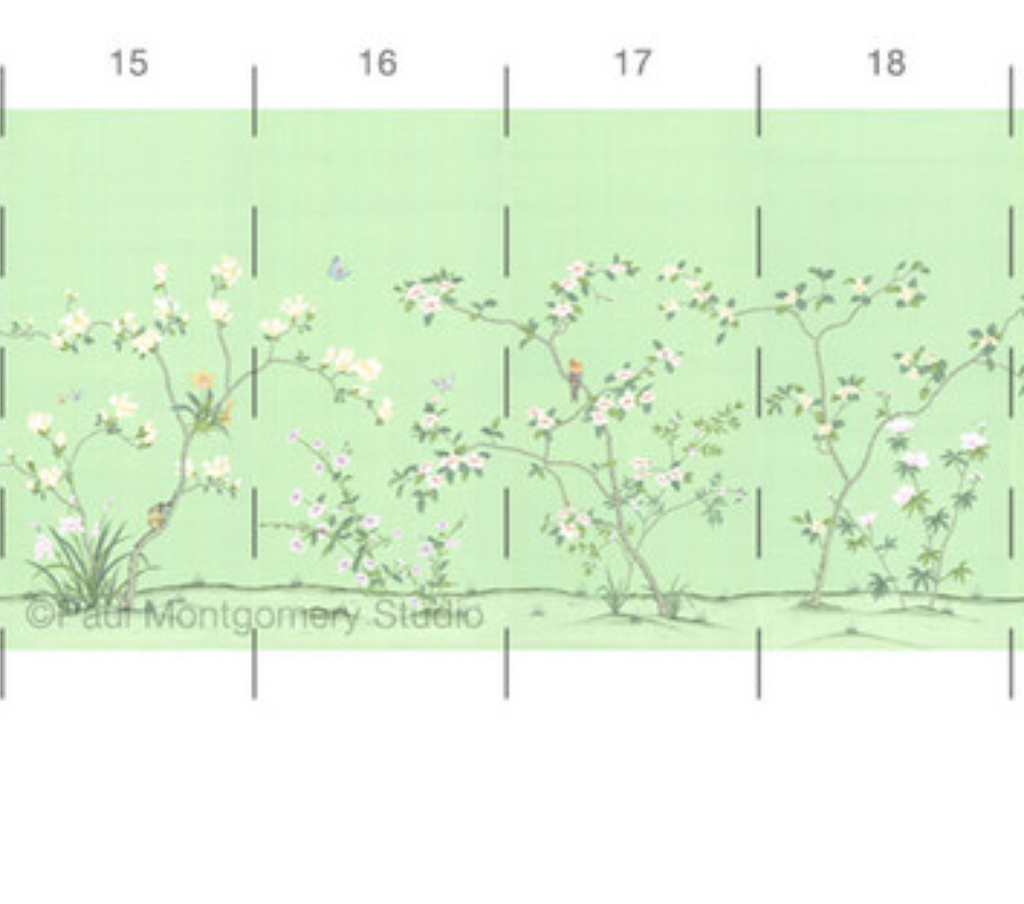 Chanteur Spring is a beautiful chinoiserie mural with multicolored birds and flowers on a bright and joyful green background. 20 Panels Available in Full Length/Headers/Footers, Sold in individual Panels, Width: 36", Design Height: 72", Total Height: 60", Chanteur Spring,Paul Montgomery Studios