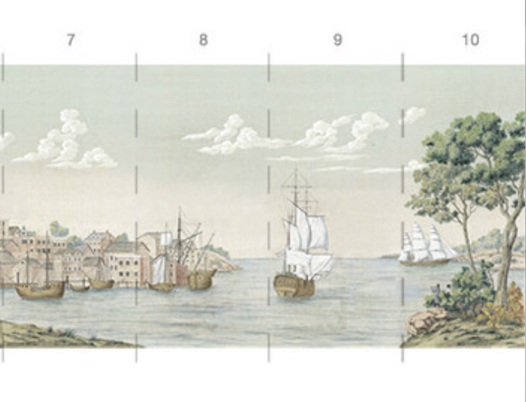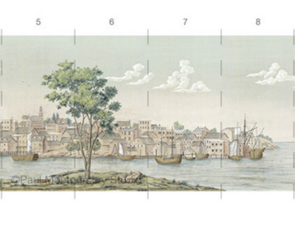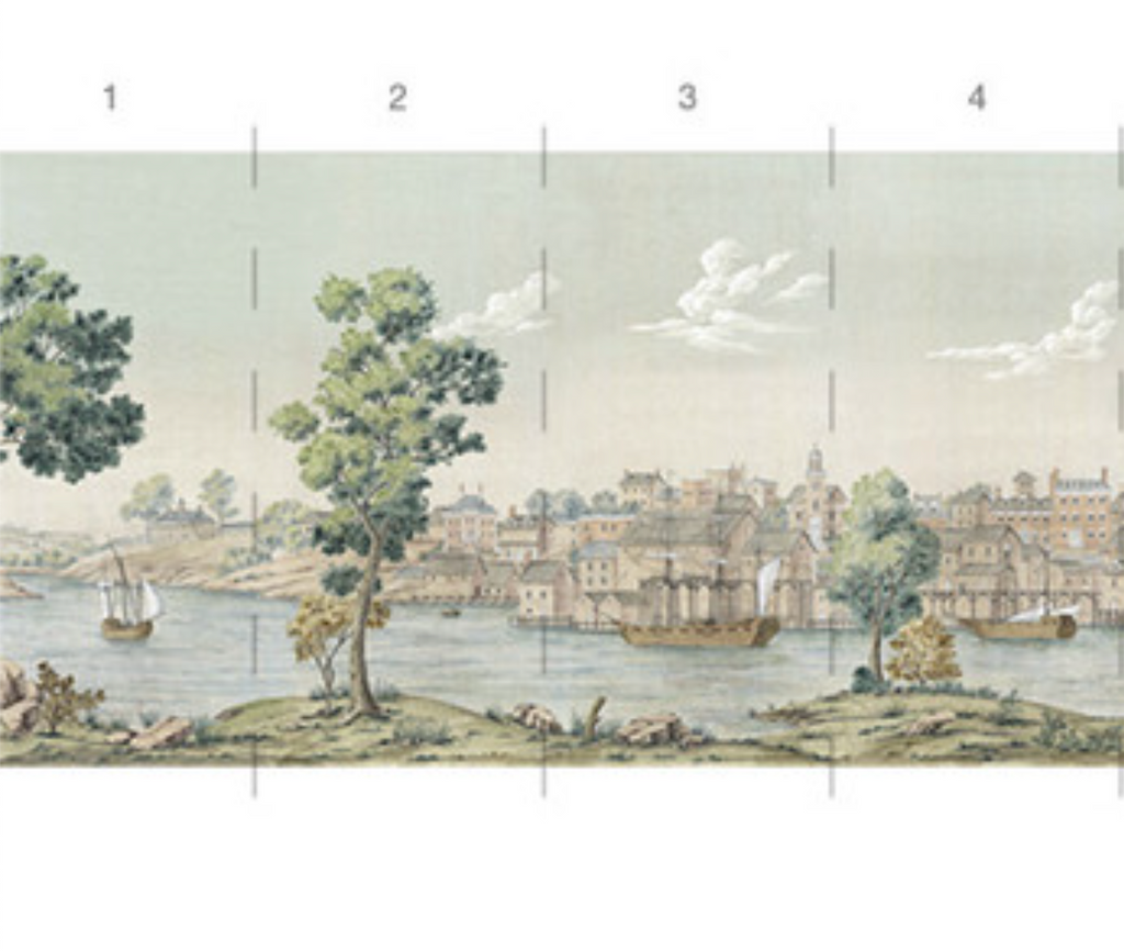 Grand Haven is a panoramic mural that depicts an idyllic Virginia coastline with sailboats and a picturesque port town. 10 Panels Available in Full Length/Headers/Footers, Sold in individual Panels, Width: 36", Design Height: 78", Total Height: 60", Grand Haven Watercolor,Paul Montgomery Studios