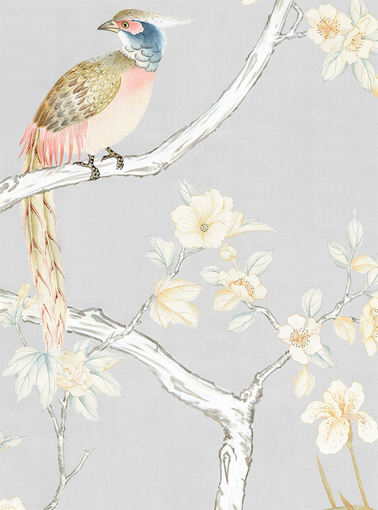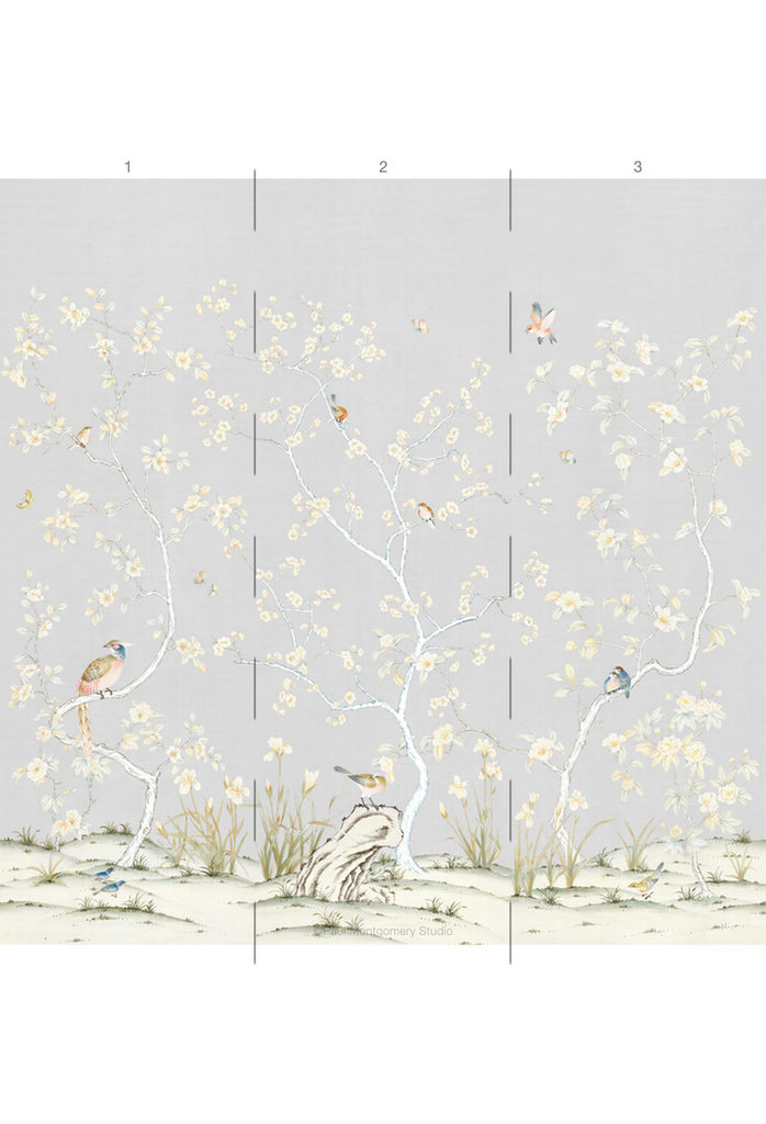 Lavena depicts whimsical trees, a brightly feathered pheasant and petite birds. Design is available in seven color themes. Panel 3 matches to panel 1 to allow the scene to repeat around a room. 3 Panels Available in Full Length/Headers/Footers, Sold in individual Panels, Width: 36", Design Height: 108", Total Height: 96", Lavena,Paul Montgomery Studios