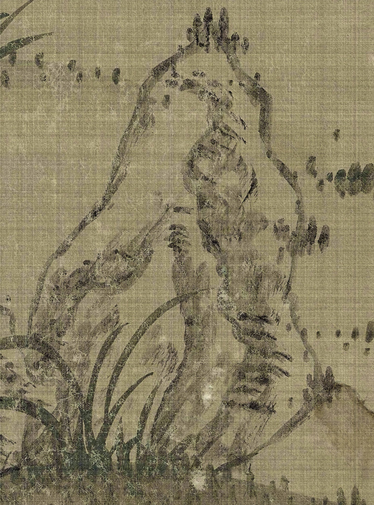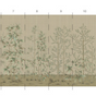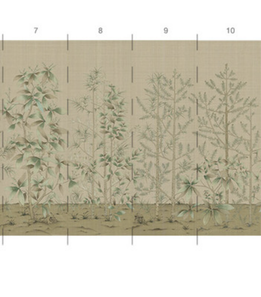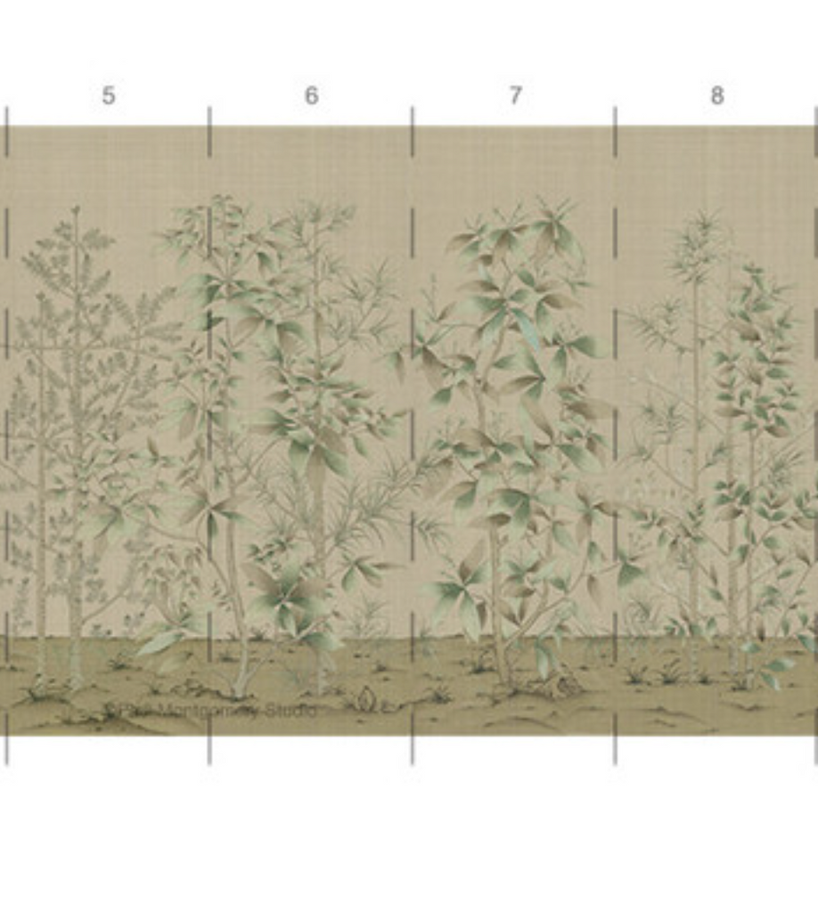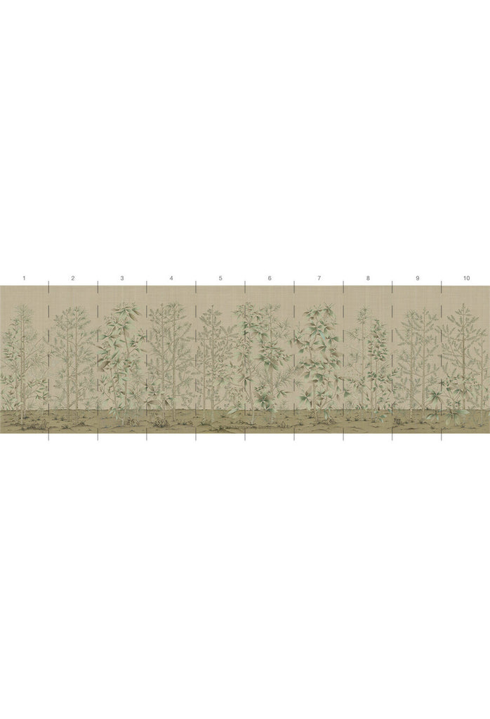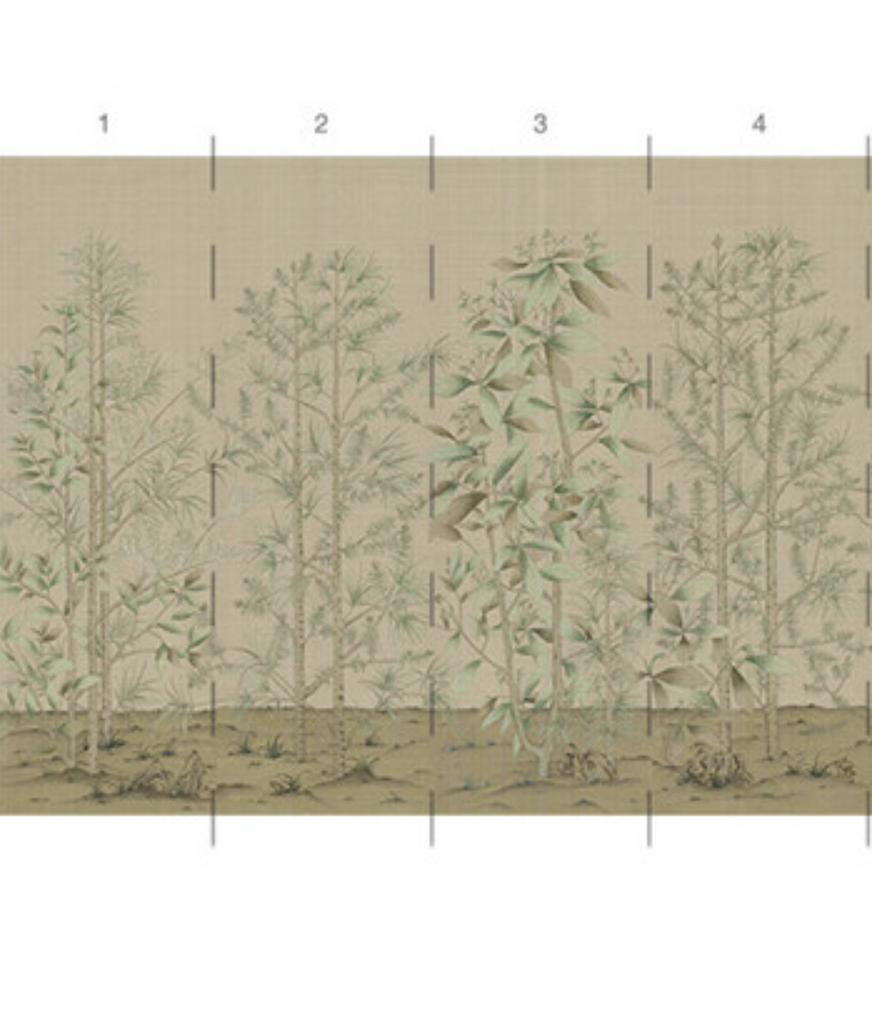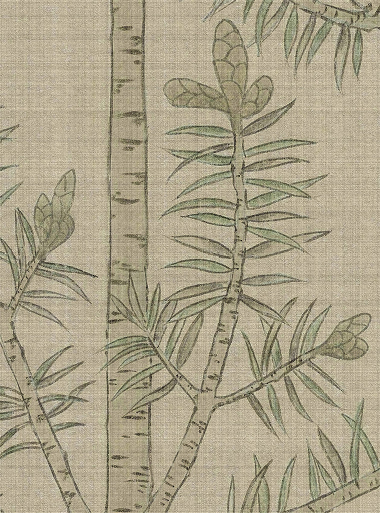 Our Quiet Forest chinoiserie mural is a peaceful scene inspired by a centuries-old Japanese screen in the Freer Gallery. Quiet Forest depicts a serene landscape of evergreen trees on a warm beige background with subtle visual weave texture. 10 Panels Available in Full Length/Headers/Footers, Sold in individual Panels, Width: 36", Design Height: 108", Total Height: 96", Quiet Forest,Paul Montgomery Studios
