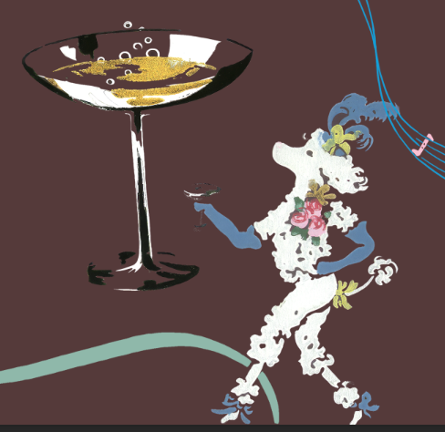 This whimsical wallcovering features a playful design with a vintage flair. The stylized poodle and champagne glass create a festive and sophisticated atmosphere, making it a unique choice for adding character to commercial spaces.