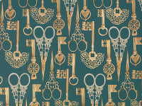 Roxanne Peacock is a sophisticated wallcovering featuring an intricate design of antique keys and scissors in metallic gold and silver against a rich teal background. Its unique pattern adds a touch of vintage charm and elegance, making it suitable for creating a refined and stylish atmosphere.