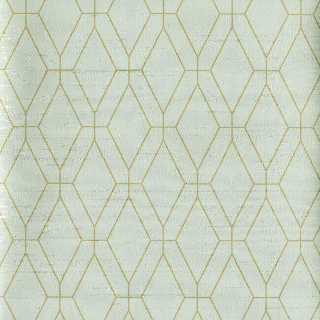 This wallcovering features a geometric pattern with a subtle Art Deco influence. The pale green background and gold lines create a sophisticated and modern look, making it suitable for various commercial applications.
