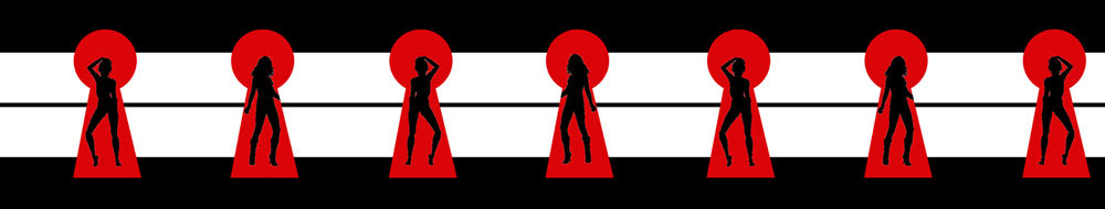 This bold and provocative wallpaper border features a striking combination of black, white, and red, creating a visually arresting design. The stylized silhouettes of exotic dancers within keyhole shapes add a touch of intrigue and sophistication, making it a unique choice for commercial spaces seeking a modern and edgy aesthetic.