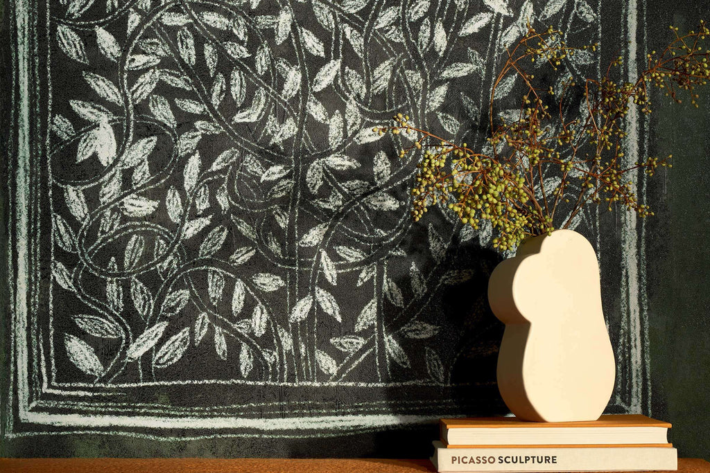 This wallcovering features a striking botanical pattern on a dark background, creating a sophisticated and modern aesthetic. The non-woven material ensures durability and ease of installation, making it ideal for high-traffic commercial spaces.
